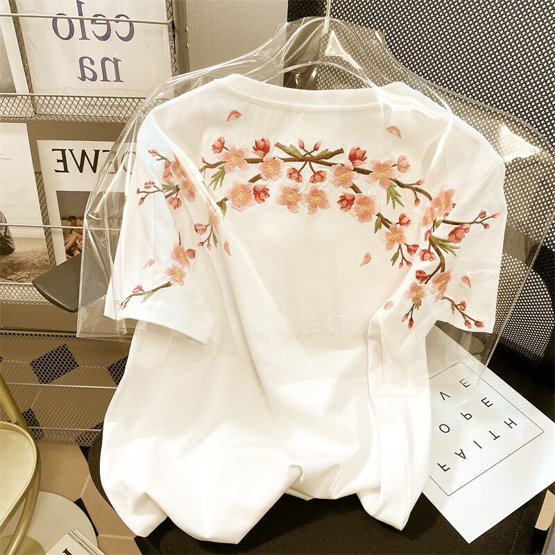 刺繍フラワー Tシャツ白クロップトップスグラフィック Tシャツグランジルース半袖 Tシャツコットン Tシャツ夏 ショート ホワイト ハーフスリーブ サマー 夏物 フラワーデザイン