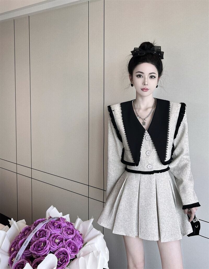 2ピースセットレディース衣装ショートグレージャケットツイードブレザーコートシャツウエストプリーツスカートスーツ服