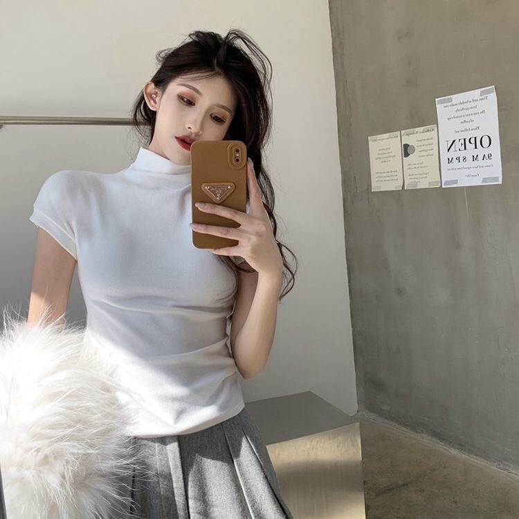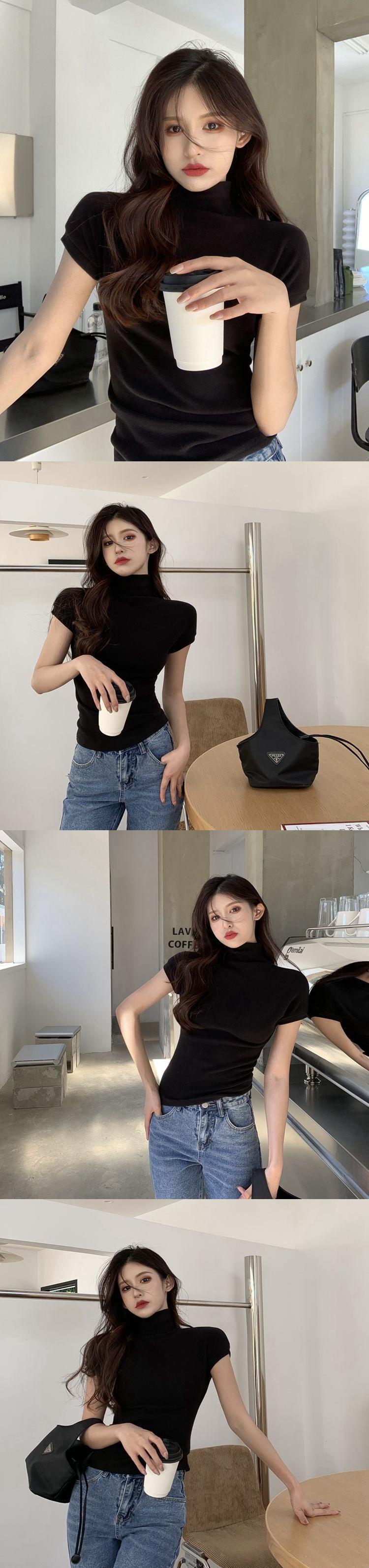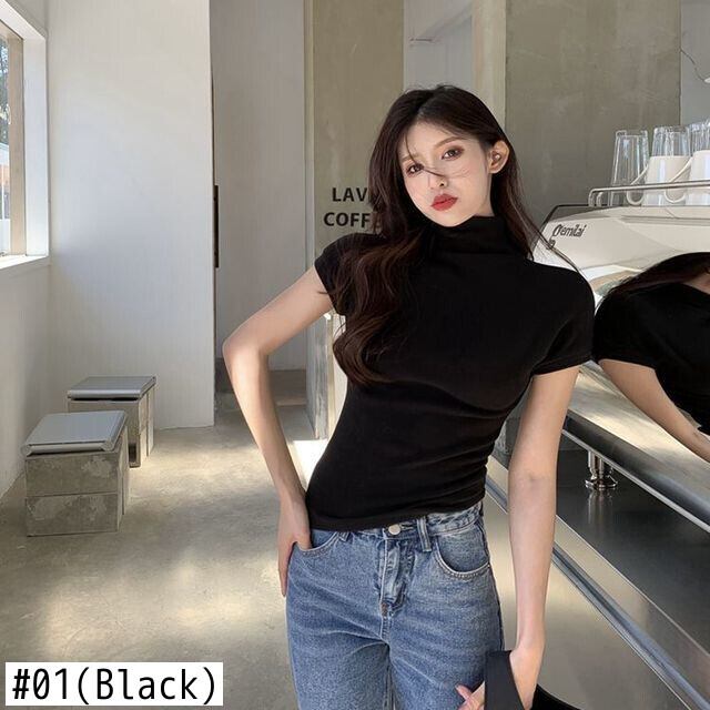 ハーフカラー半袖 Tシャツ弾性ワイルド Tシャツ黒、白のシャツ春スリム Tシャツトップス ショート ホワイト ブラック ハーフスリーブ エラスティック 伸縮 スプリング 春物 ソリッドカラー
