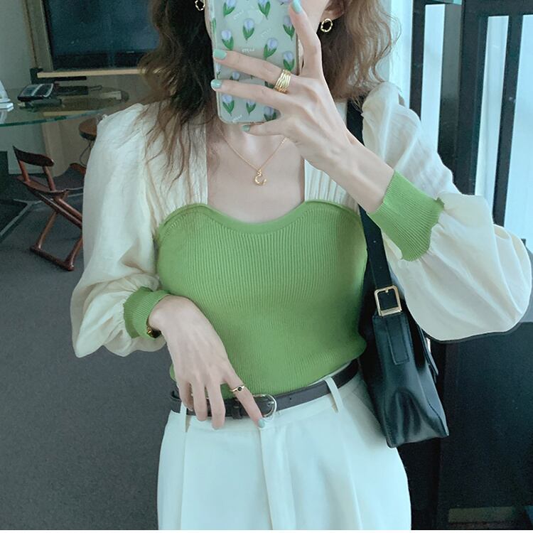 シャツスリム春白シフォンシャツ長袖スクエアカラーセーターセータージャージーニットトップス ロング ホワイト スプリング 春物 スクウェア