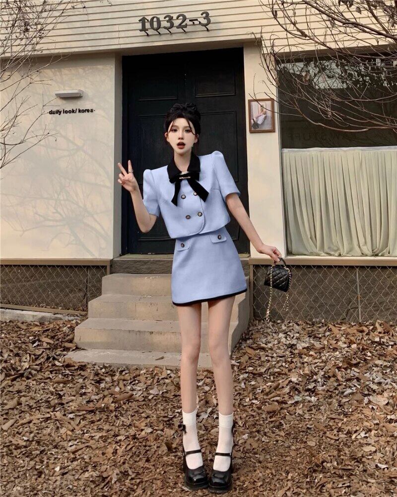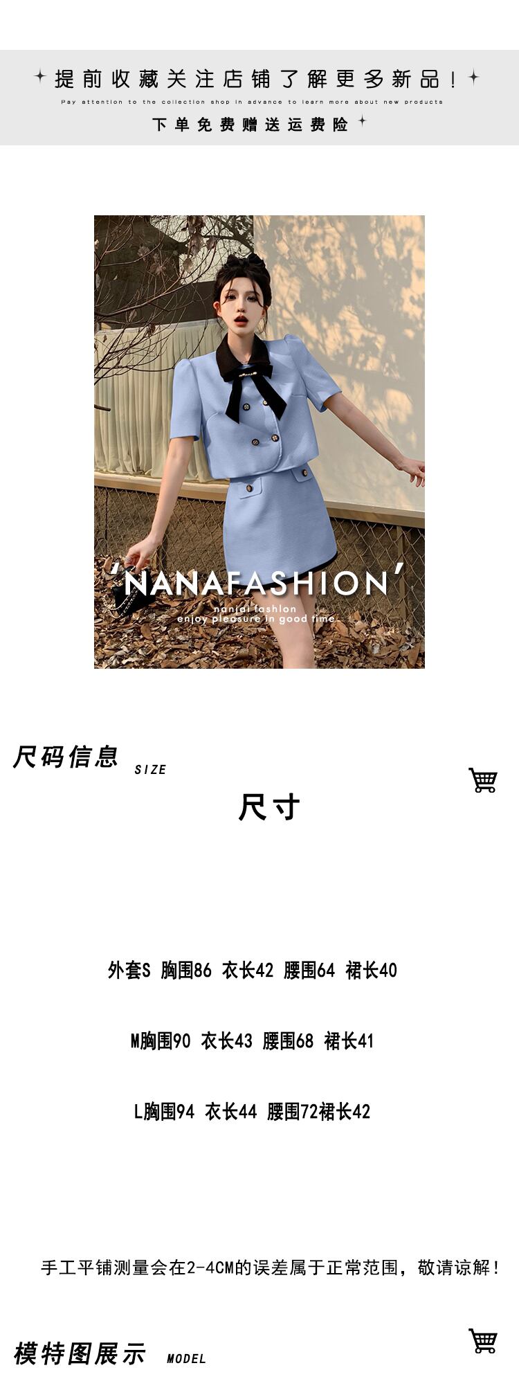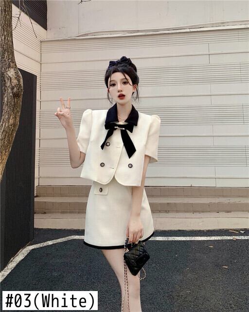 半袖カーディガンショートツイードコートボディコンスカート気質弓ブレザーfemenino白スカートスーツ夏OLレトロ ホワイト リボン ハーフスリーブ サマー 夏物