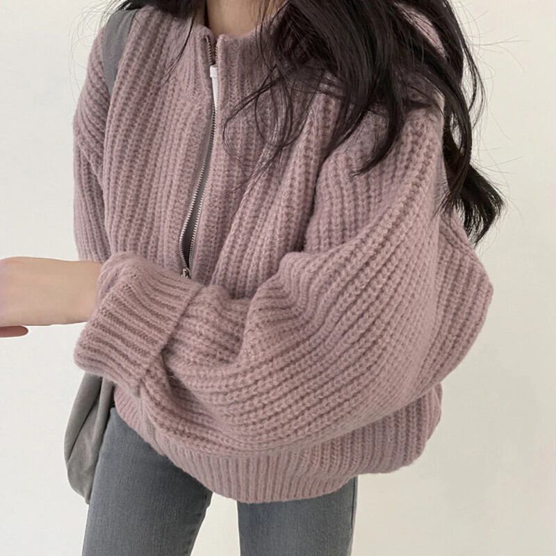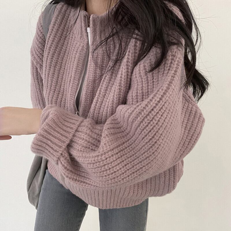 怠惰な春ルーズアウターグレーニットカーディガンのショートジッパーセーターパフカーディガン Feminino 長袖トップス ロング スプリング 春物