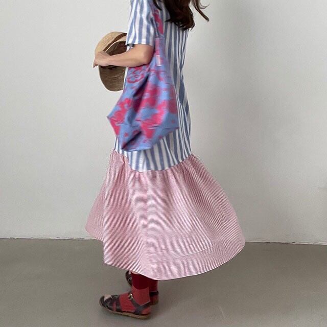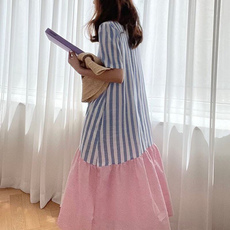 O ネック コントラスト パッチワーク ルーズ フリル ストライプ ドレス Vestidos マーメイド ドレスの半袖 ショート ハーフスリーブ