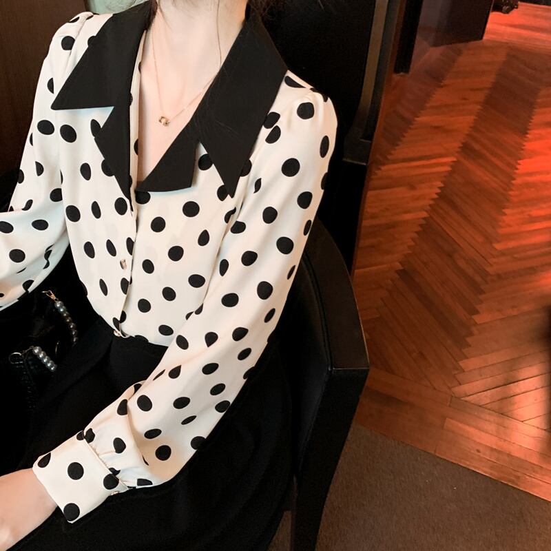 コントラストカラー人形長袖ポルカドットシャツシフォンカミーサトップス OL ブラウス春シャツ ロング スプリング 春物