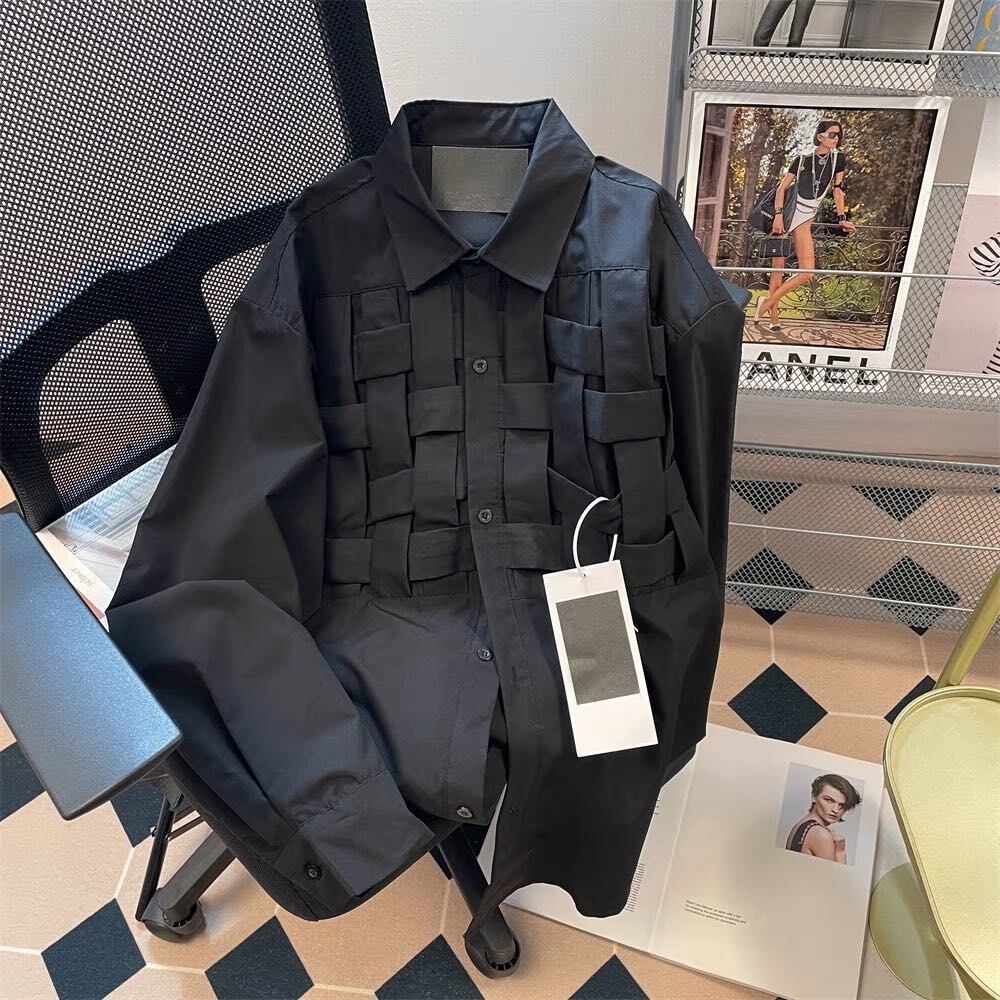 織カットアウトビッグサイズストライプシャツラペル長袖ボタンスルーブラウス夏春 ロング スプリング 春物 サマー 夏物