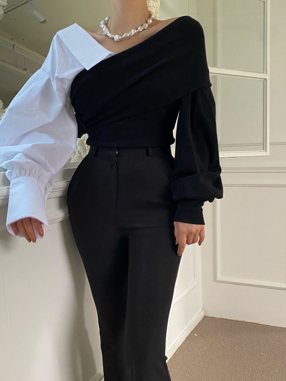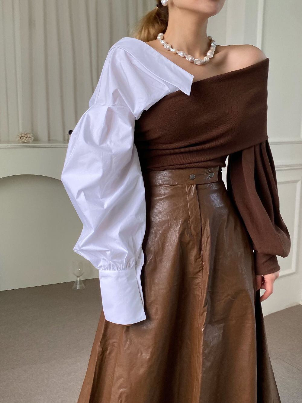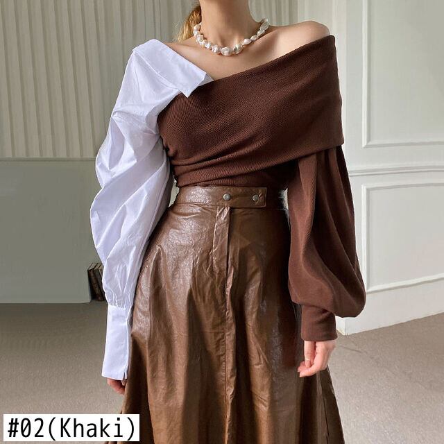 シャツパフスリーブセクシーな V オフショルダーコントラストパッチワークフェイクツーピースプルオーバーセーターセータートップセーター