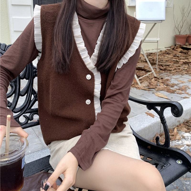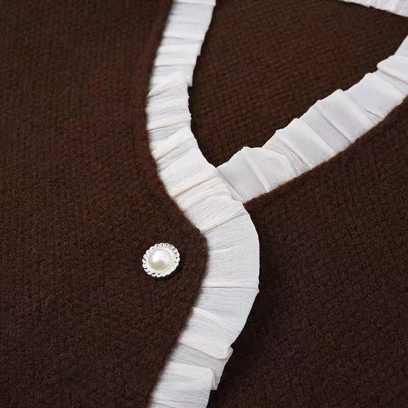レースフリル菌小香りコートカーディガン秋の V ネック黒のベストの Chalecos パラシックなチョッキ ブラック オータム 秋物 Vネック