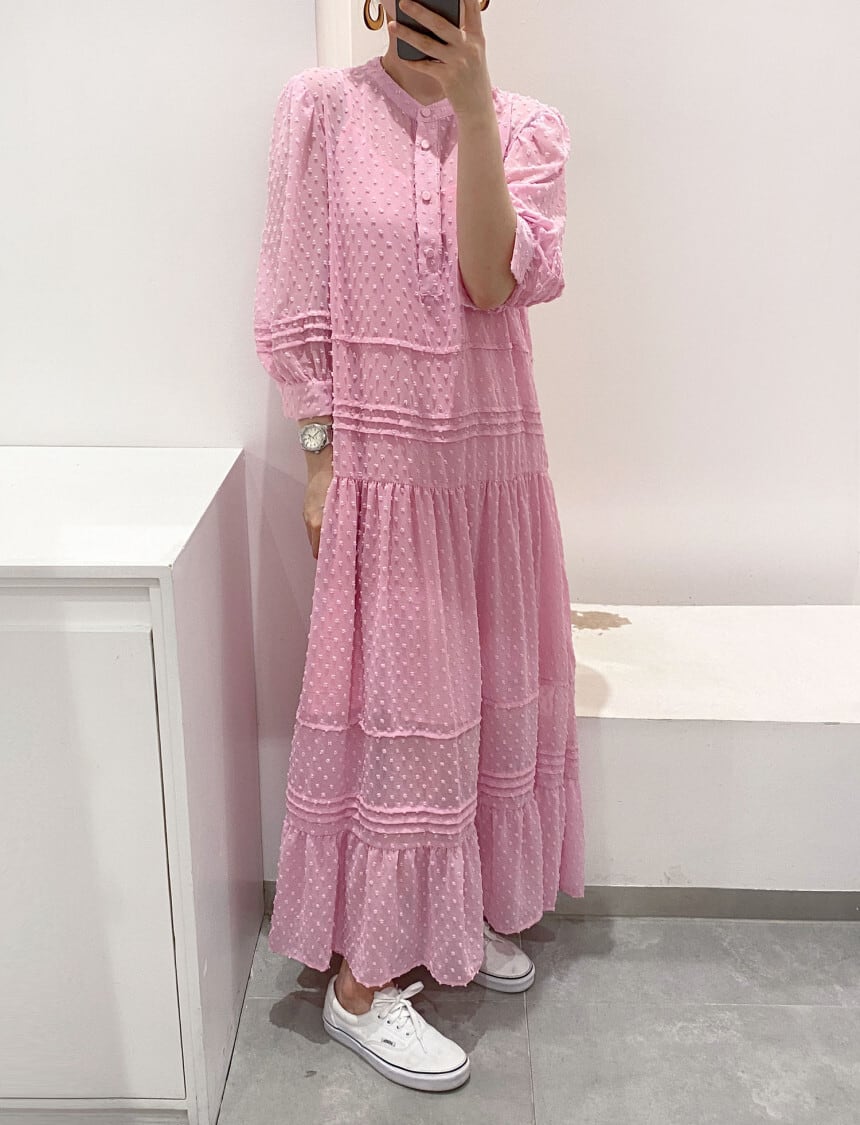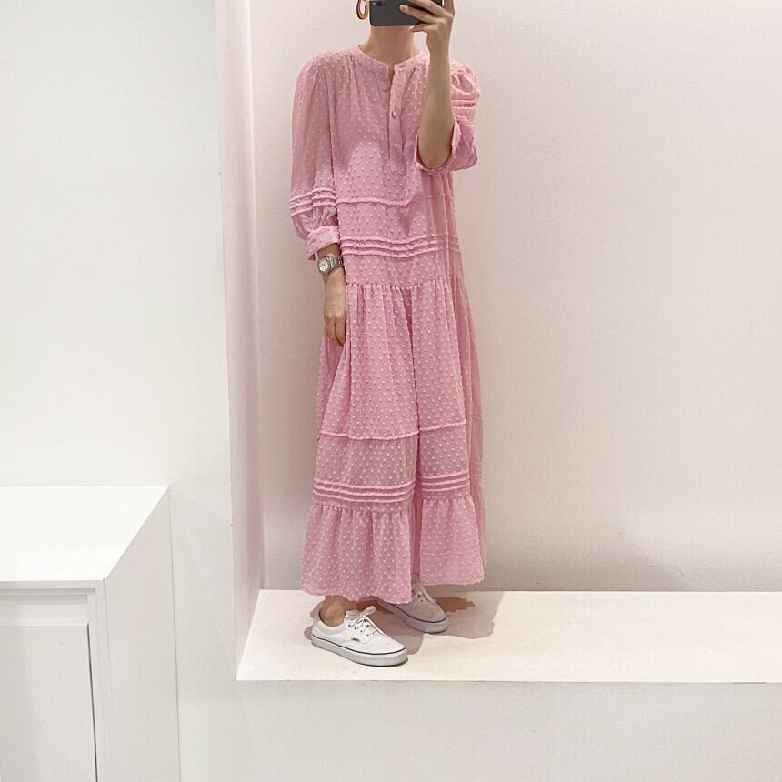 シックな 3D 花パッチワーク長袖ミディピンクドレス春 Vestidos デビーチホリデードレスフリル甘い ロング 大人ガーリー スウィート キュート カジュアル スプリング 春物 フラワーデザイン