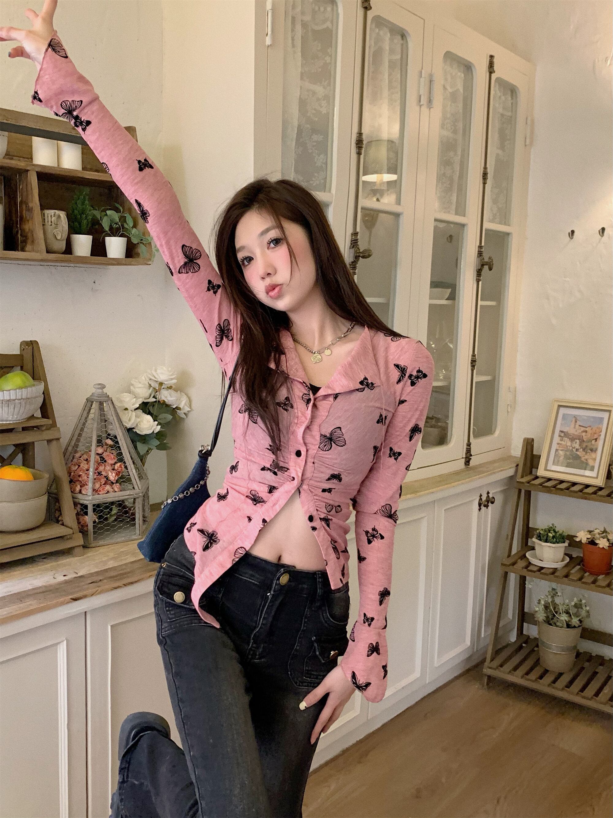 セクシーな Y2k ブラウススリムウエストピンクバタフライシャツタイトニットカーディガントップスデモーダクロップシャツ