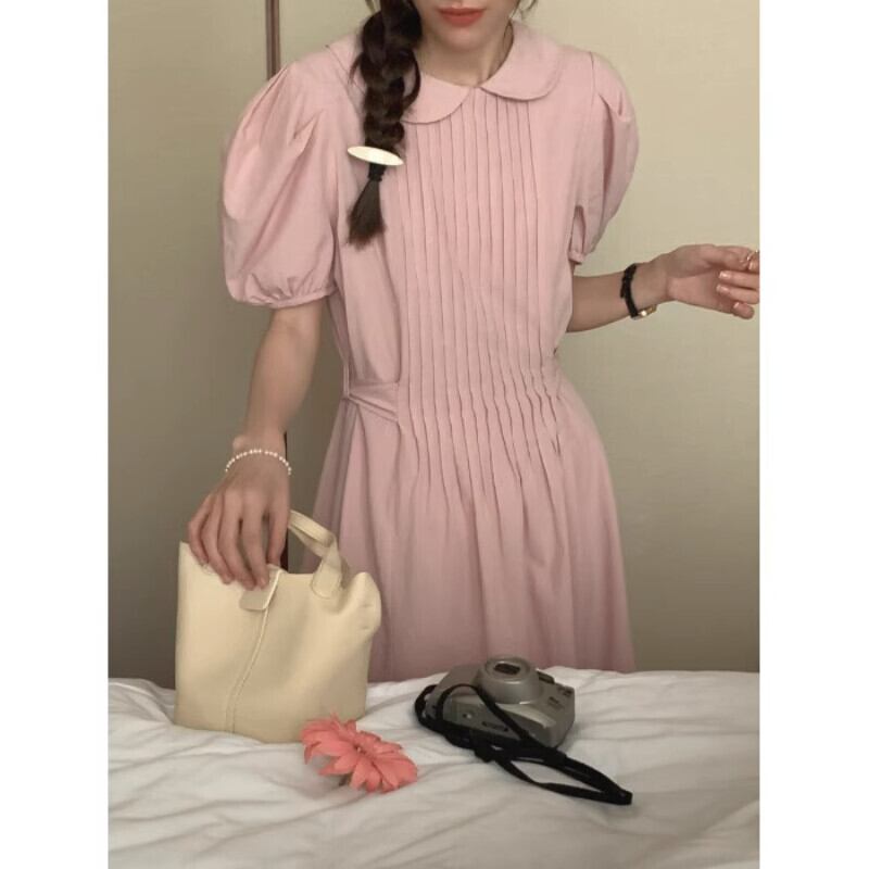 甘いスタイルaラインピンクドールドレスパフ半袖ボディコンドレスvestidosプリーツ夏 ショート ハーフスリーブ 大人ガーリー スウィート キュート カジュアル サマー 夏物