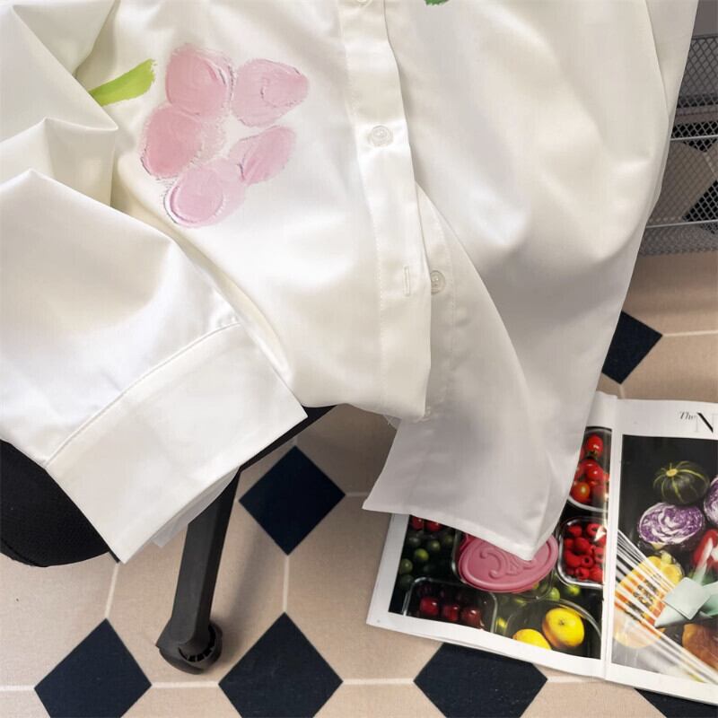 ルーズフラワー長袖グラフィティシャツデモーダシックなトップスシャツ白ブラウスシャツ ロング ホワイト フラワーデザイン