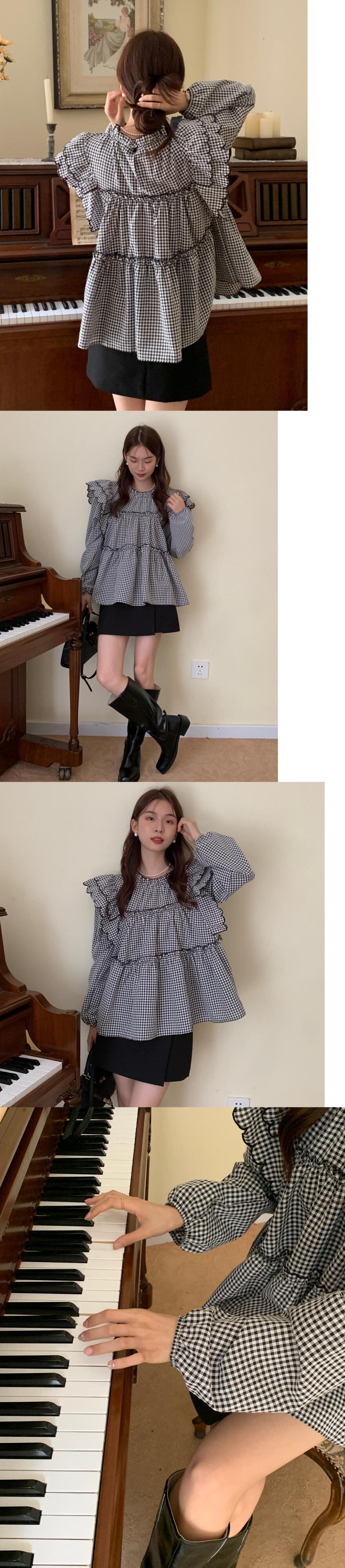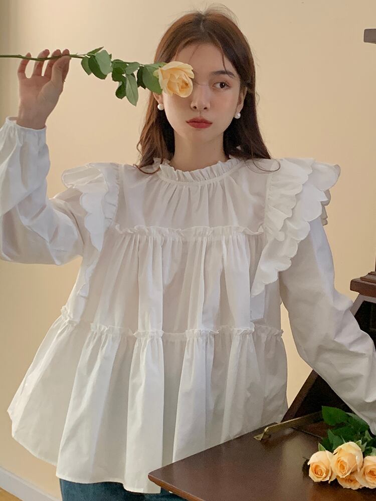 ルーズスウィートホワイトドールブラウスフリルトップス春長袖白シャツデレトロチェック柄シャツ ロング 大人ガーリー キュート カジュアル スプリング 春物