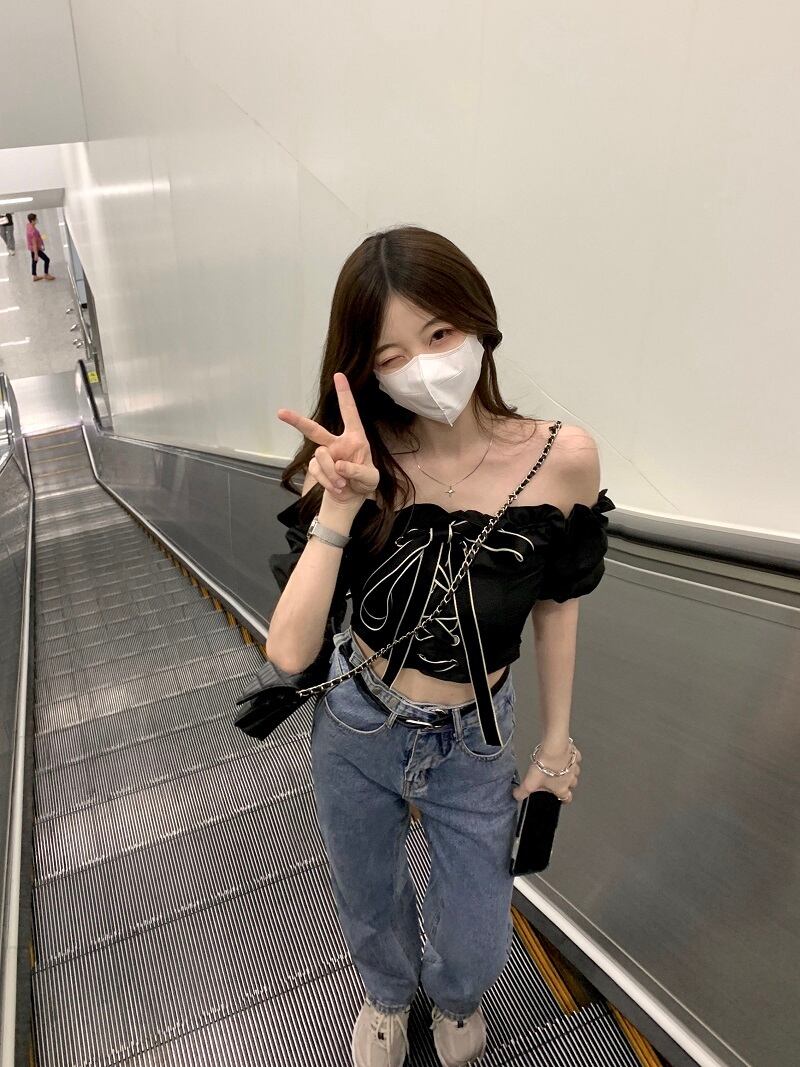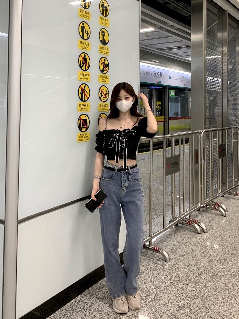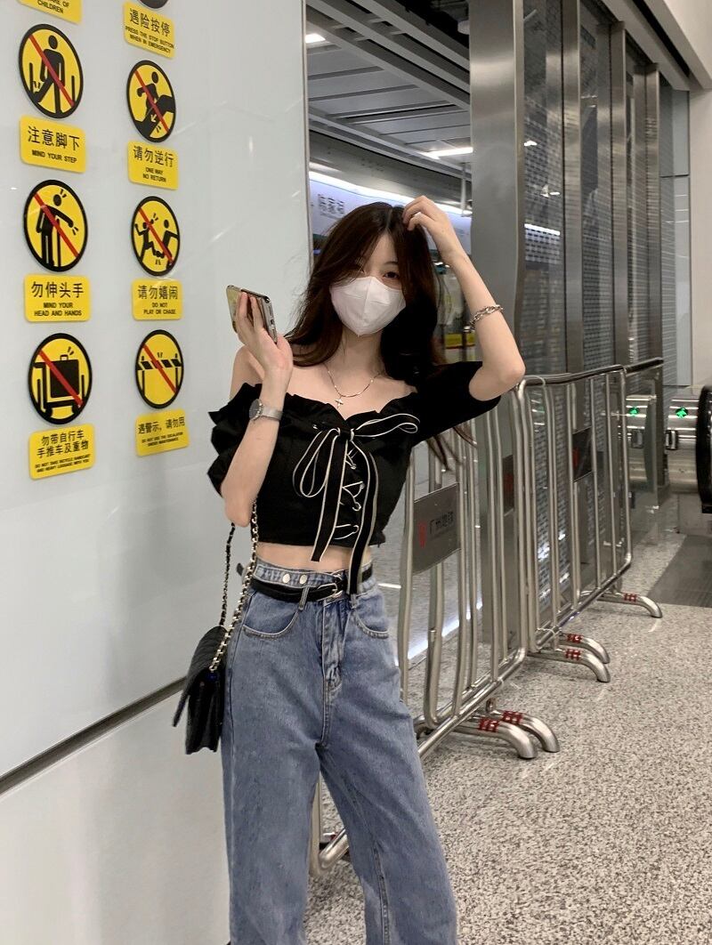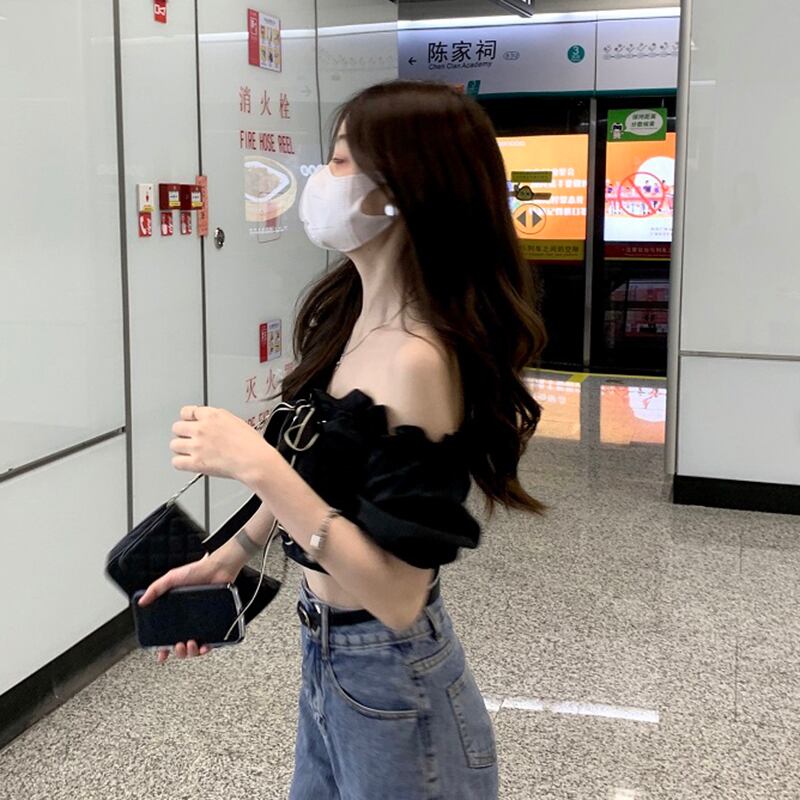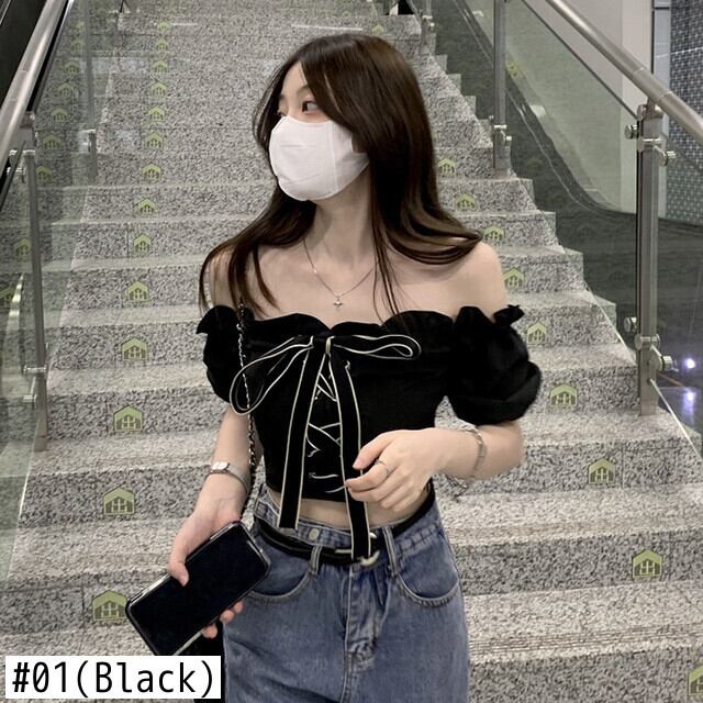 セクシーなスラッシュネッククロップトップス弓パフ半袖黒 Tシャツ Y2k Tシャツグランジレトロシャツの夏の Tシャツ ショート ブラック リボン ハーフスリーブ サマー 夏物