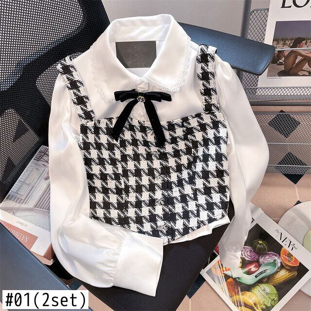 短い千鳥格子ベスト弓シャツ ブラウスレトロ ホワイト シャツ ツイード クロップ トップ 2 セット春 ショート リボン スプリング 春物