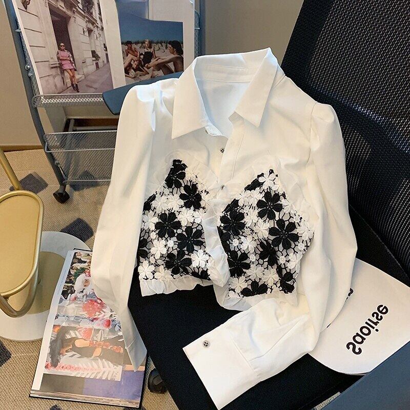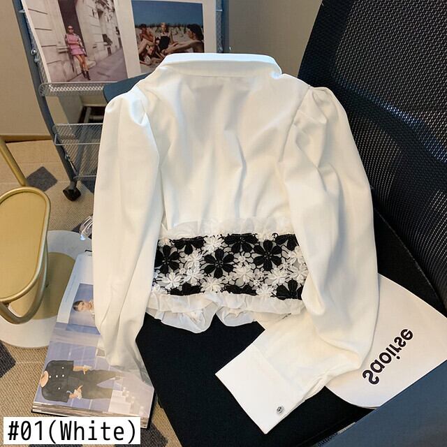 レディース 長袖 白シャツ フェイクツーピース ブラウス ゆったり レース フラワーシャツ パッチワーク トップス 春 OL ロング ホワイト スプリング 春物 フラワーデザイン