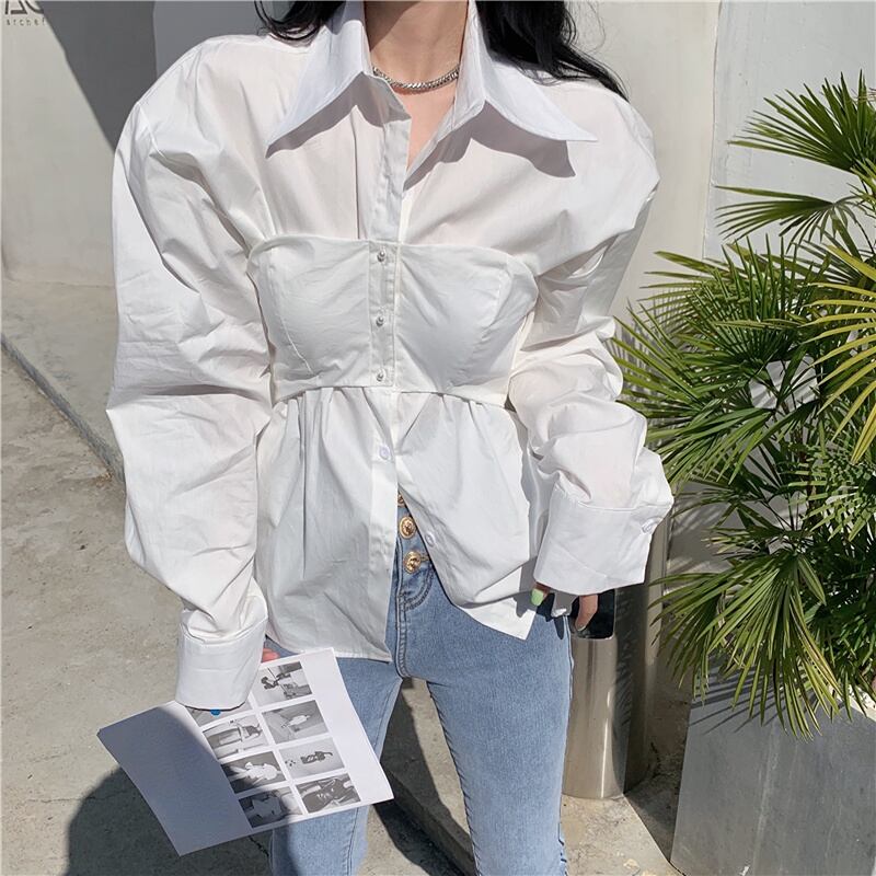 春ストラップレストップススリムウエストラペルフェイク 2 白シャツ長袖ルーズブラウスコルセット野生 OL ロング ホワイト スプリング 春物