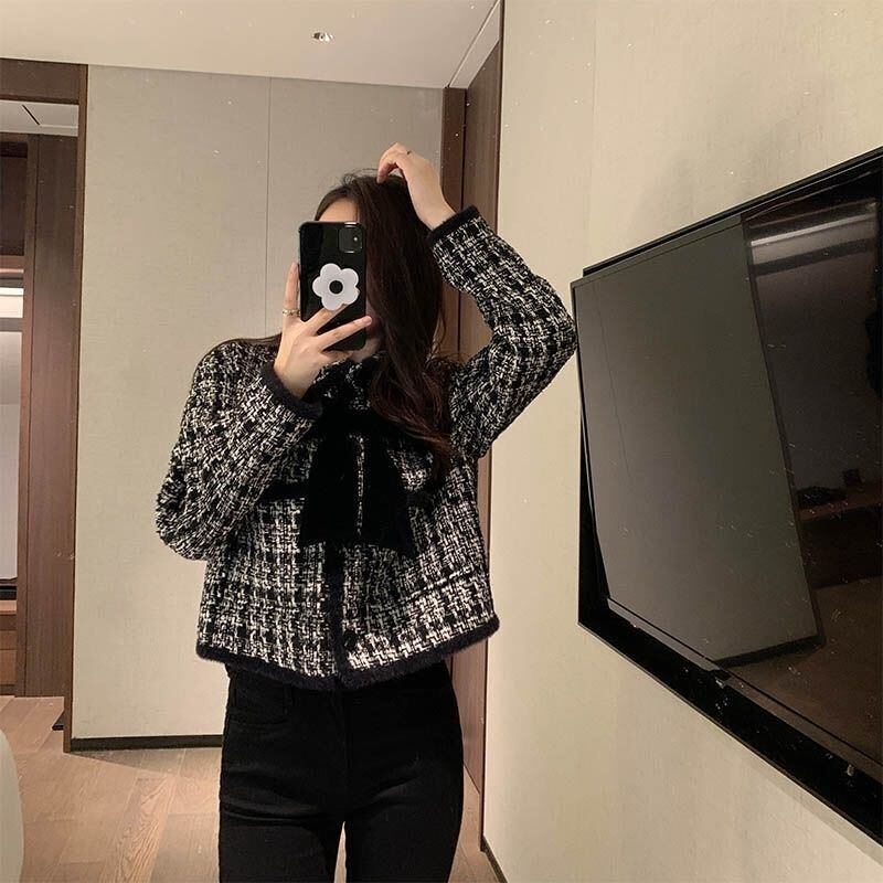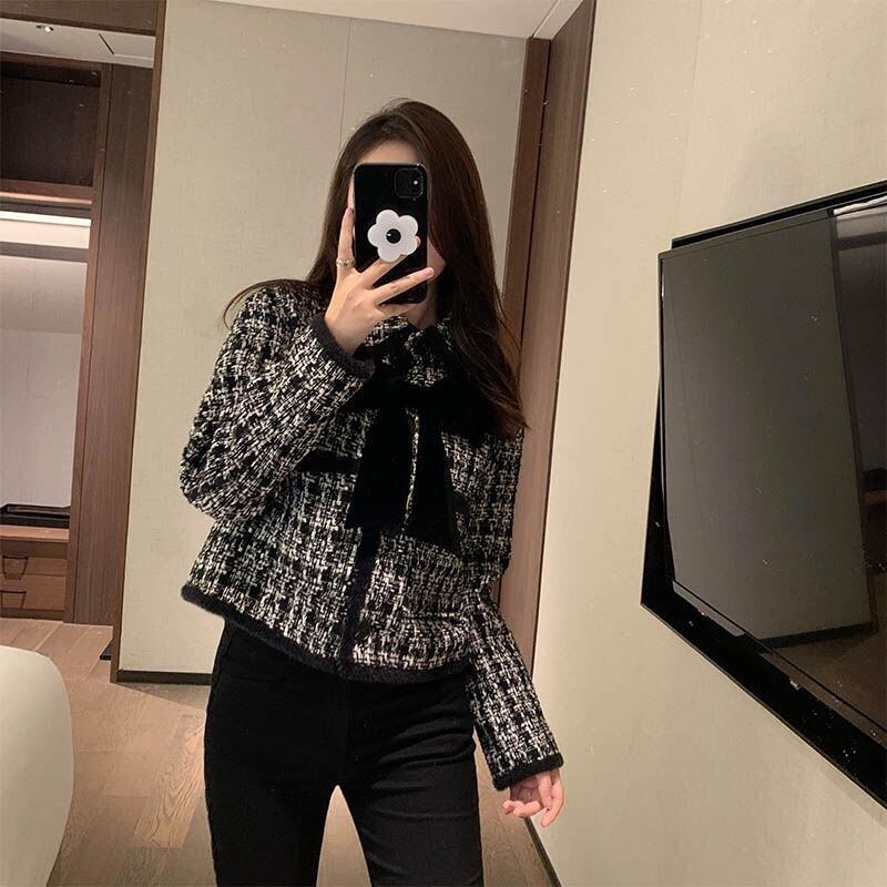 ショートキルティングコート弓黒チェック柄コートスタイル秋ツイードカーディガン Chaquetas パーカー Jaqueta ジャケットスーツ ブラック リボン オータム 秋物