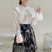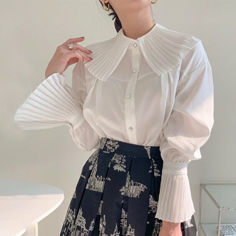 の気質のシャツ白プリーツラペルシングルブレストフレアスリーブシャツ OL レディブラウス春トップ ホワイト スプリング 春物