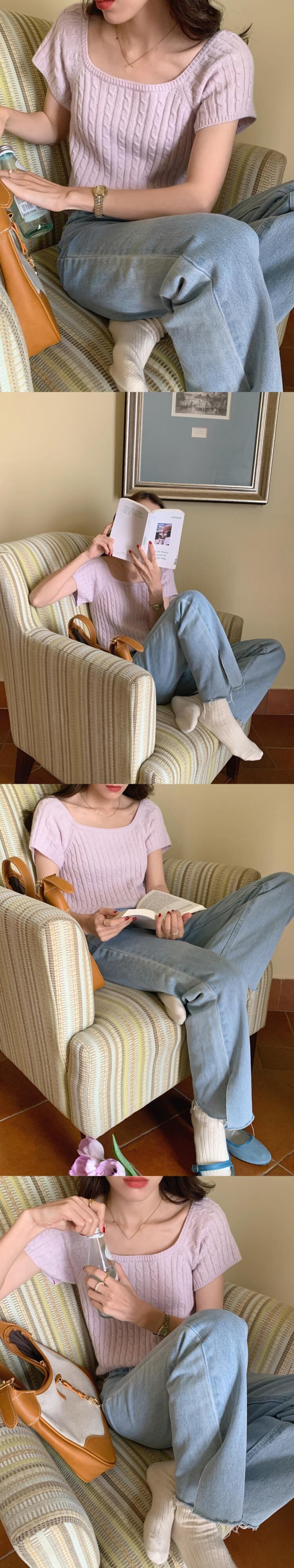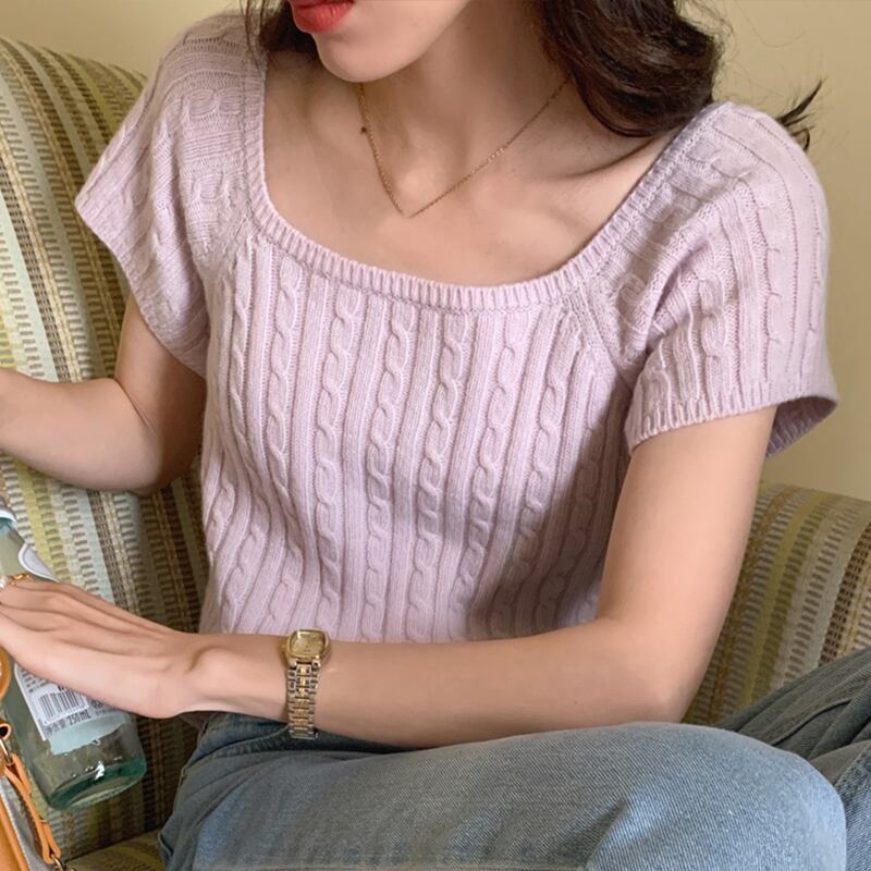 シャツプルオーバージャージーセータージャンパースクエア半袖セータークロップツイストニットセータートップス ショート ハーフスリーブ スクウェア