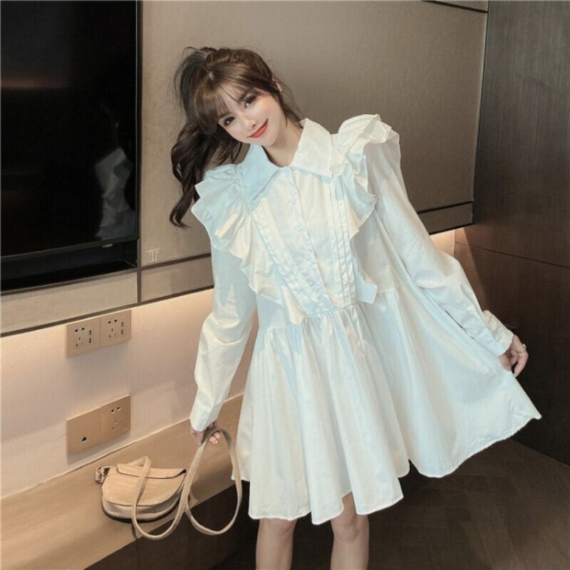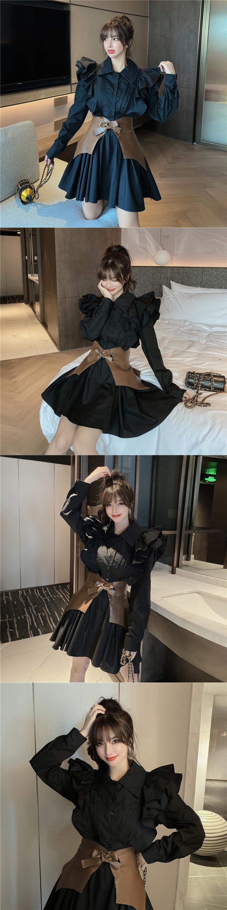 ミニフリル長袖白シャツドレス PU ウエストレースアップスカートセット春 2 点セットレディース衣装 ロング ホワイト スプリング 春物