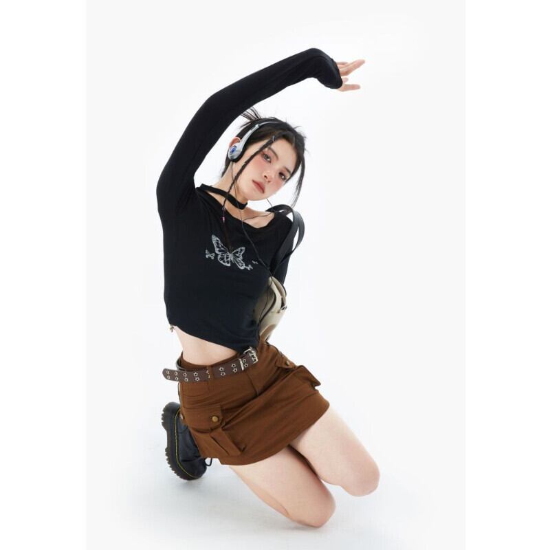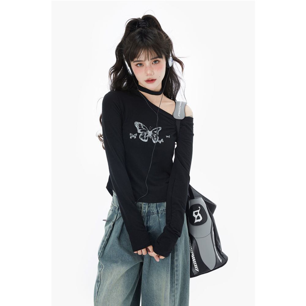 オフショルダー黒蝶 Tシャツグラフィック Tシャツ Y2k トップシックなルーズプリントパーカー Tシャツスウェットシャツ ブラック