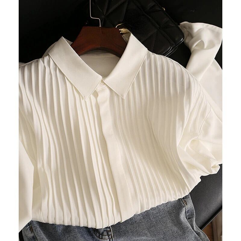 白シャツ レディース ブラウス ワイルド OL プリーツ トップス ルーズ ターンダウンカラー 長袖シャツ シフォン ロング ホワイト