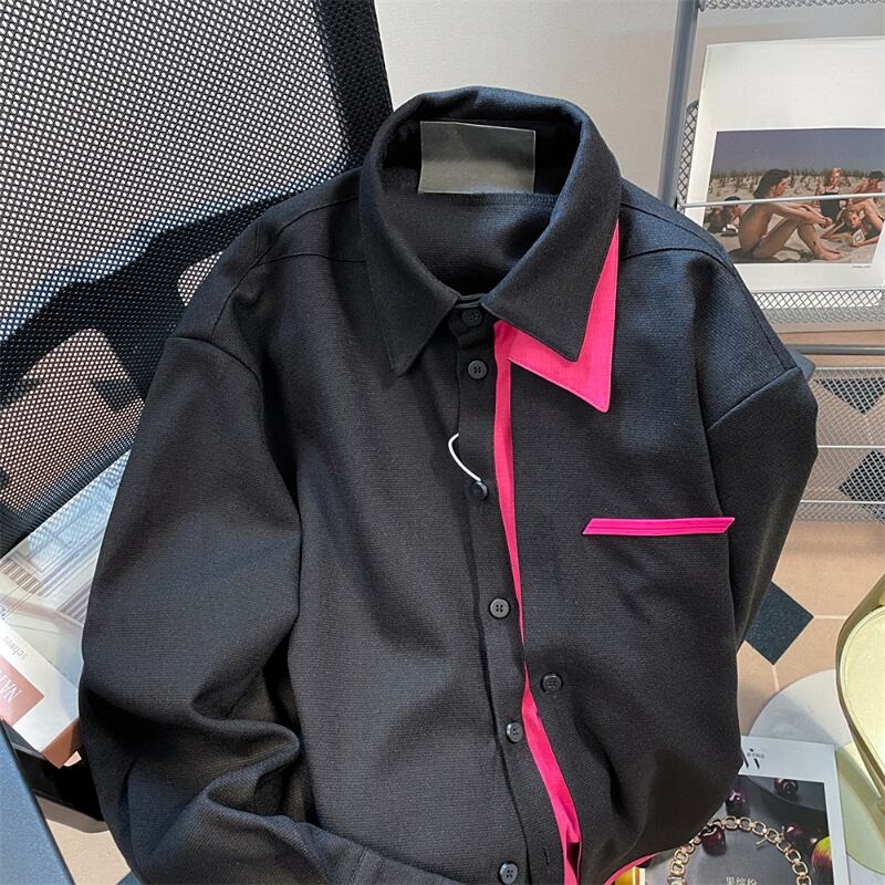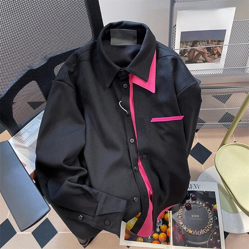 ルーズコントラストシャツレディース春長袖トップシャツ黒ブラウスシャツワイルド ロング ブラック スプリング 春物