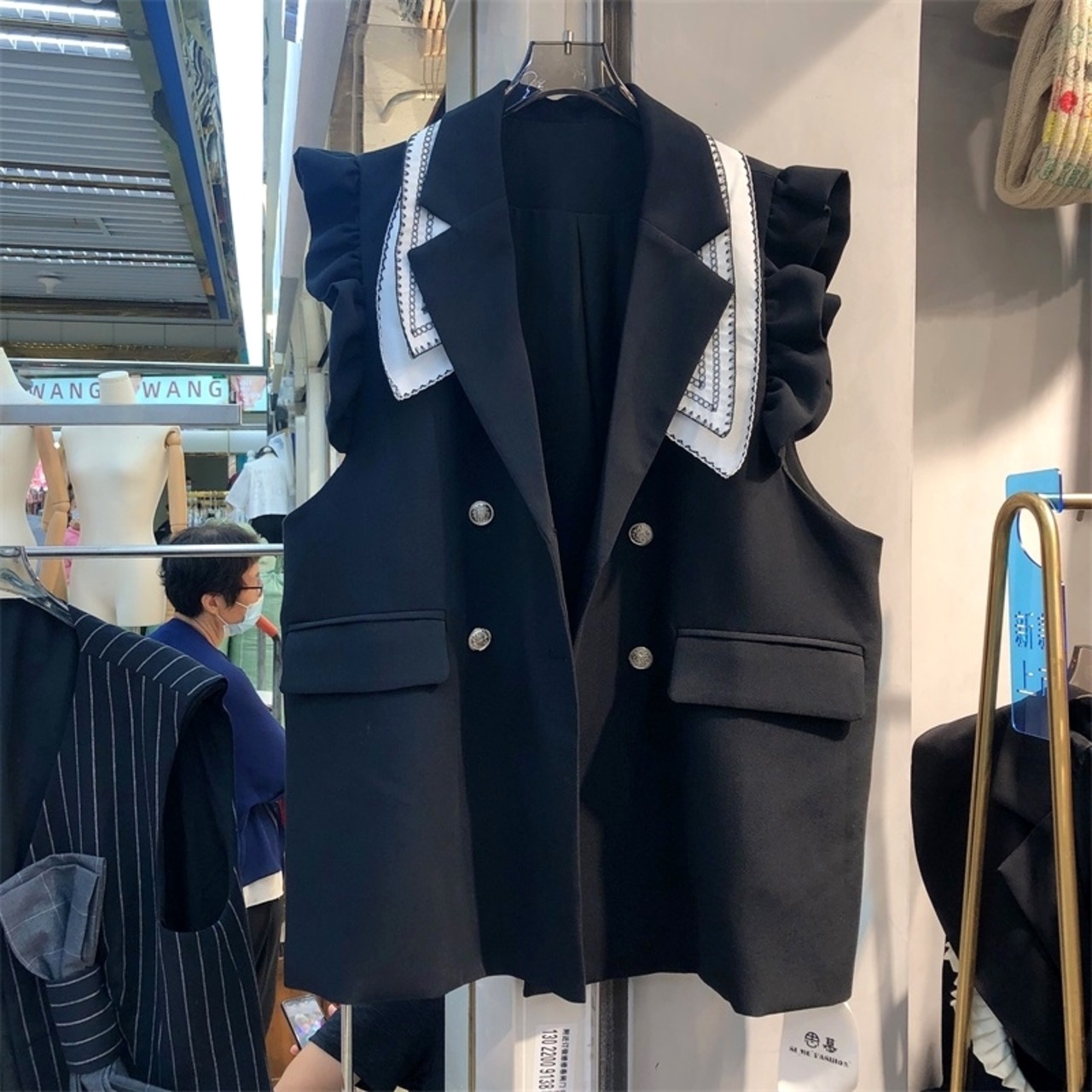 Chalecos ダブルブレスト黒ノースリーブベストフリル OL ルーズチョッキ春黒ブレザー Feminino ブラック スプリング 春物