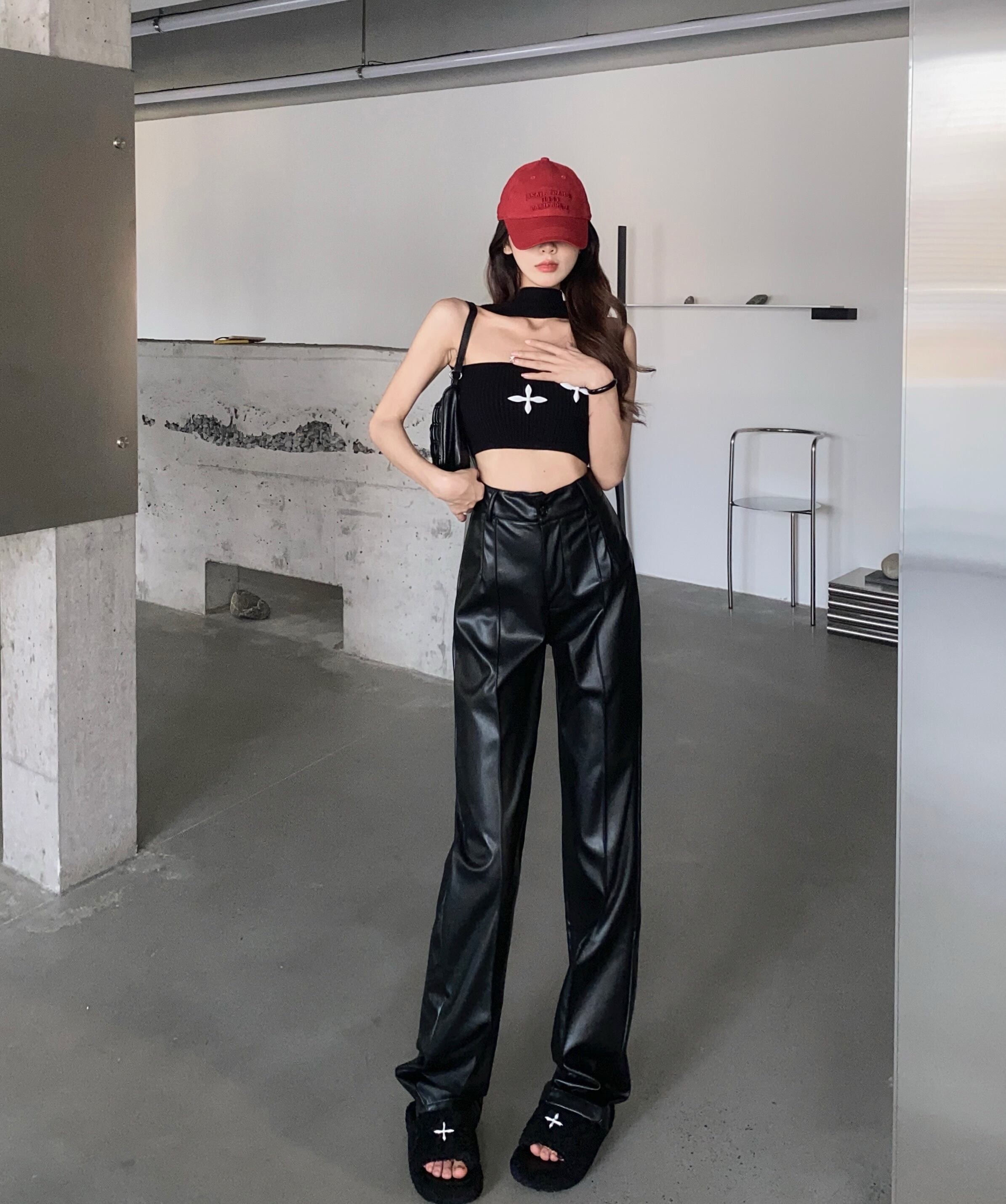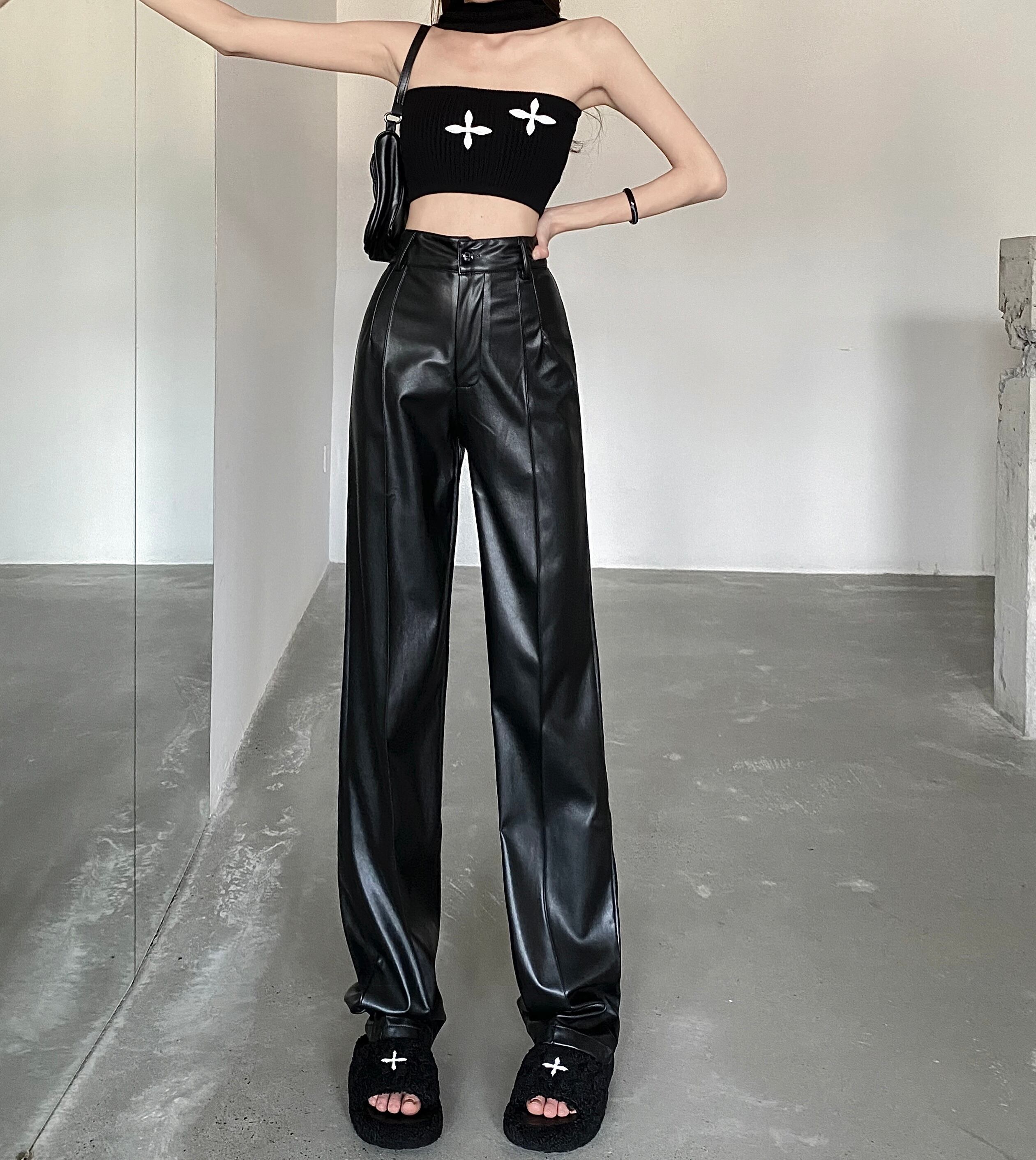 ワイドレッグストレートルーズブラックレザーパンツ Pantalones ストリート PU ズボンカプリパンツカーゴパンツ ワイドパンツ
