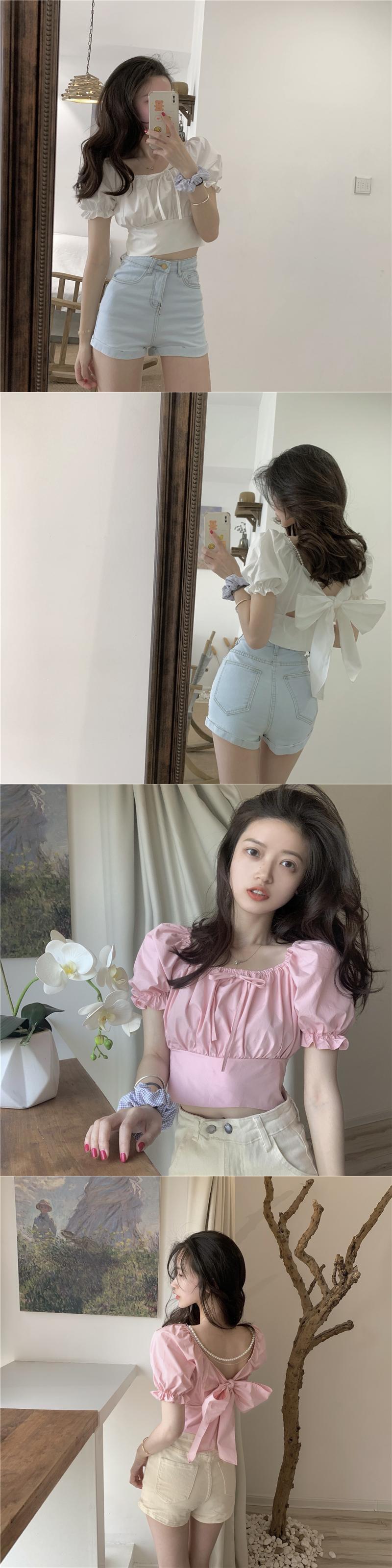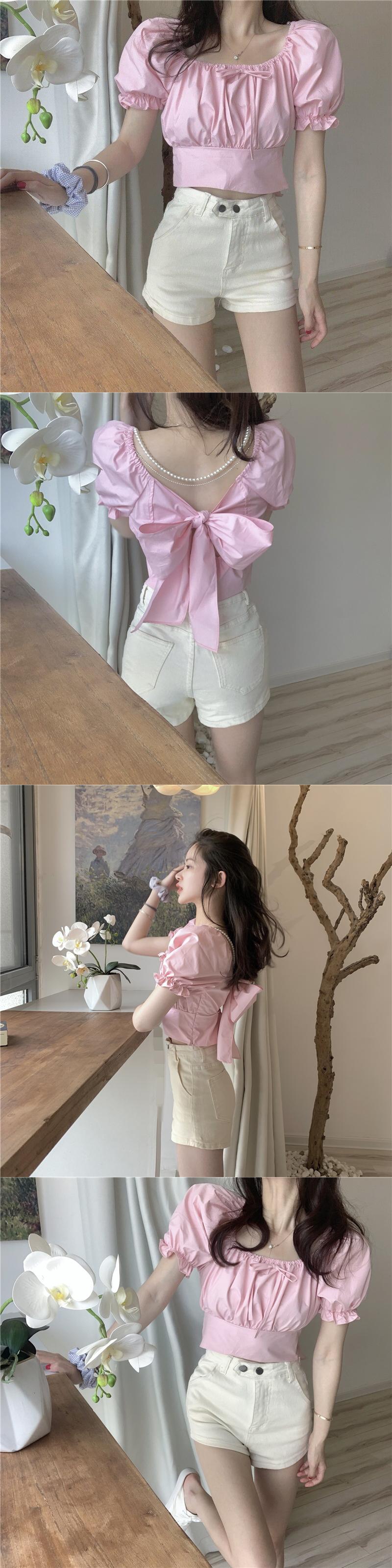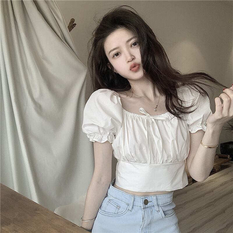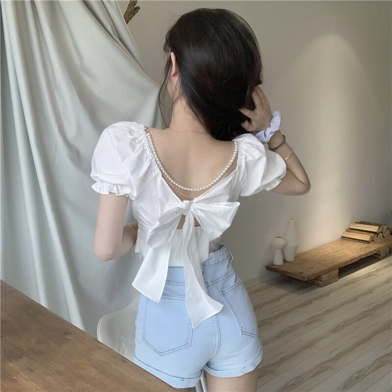 ブラウススリムセクシー夏クロップトップススクエアホワイトシャツウエストボウカミーサ人形シャツ リボン サマー 夏物 スクウェア