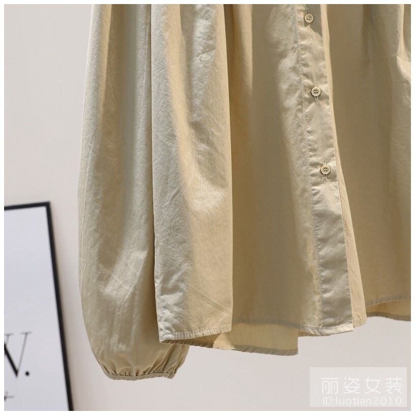 O ネックルーズカーキプリーツコットンランタンスリーブシャツトップスワイルドホワイトシャツ Blusa ブラウス