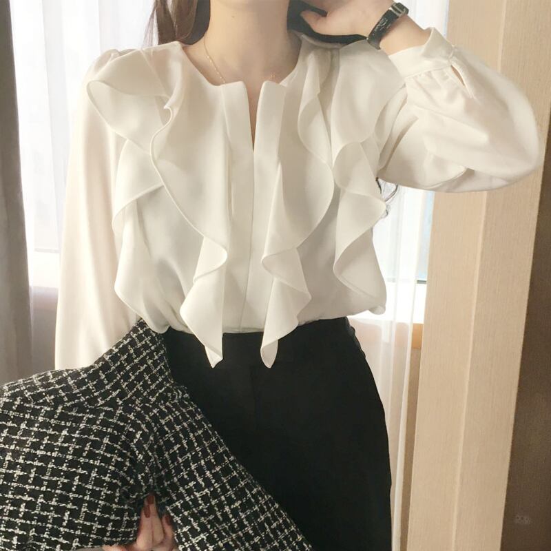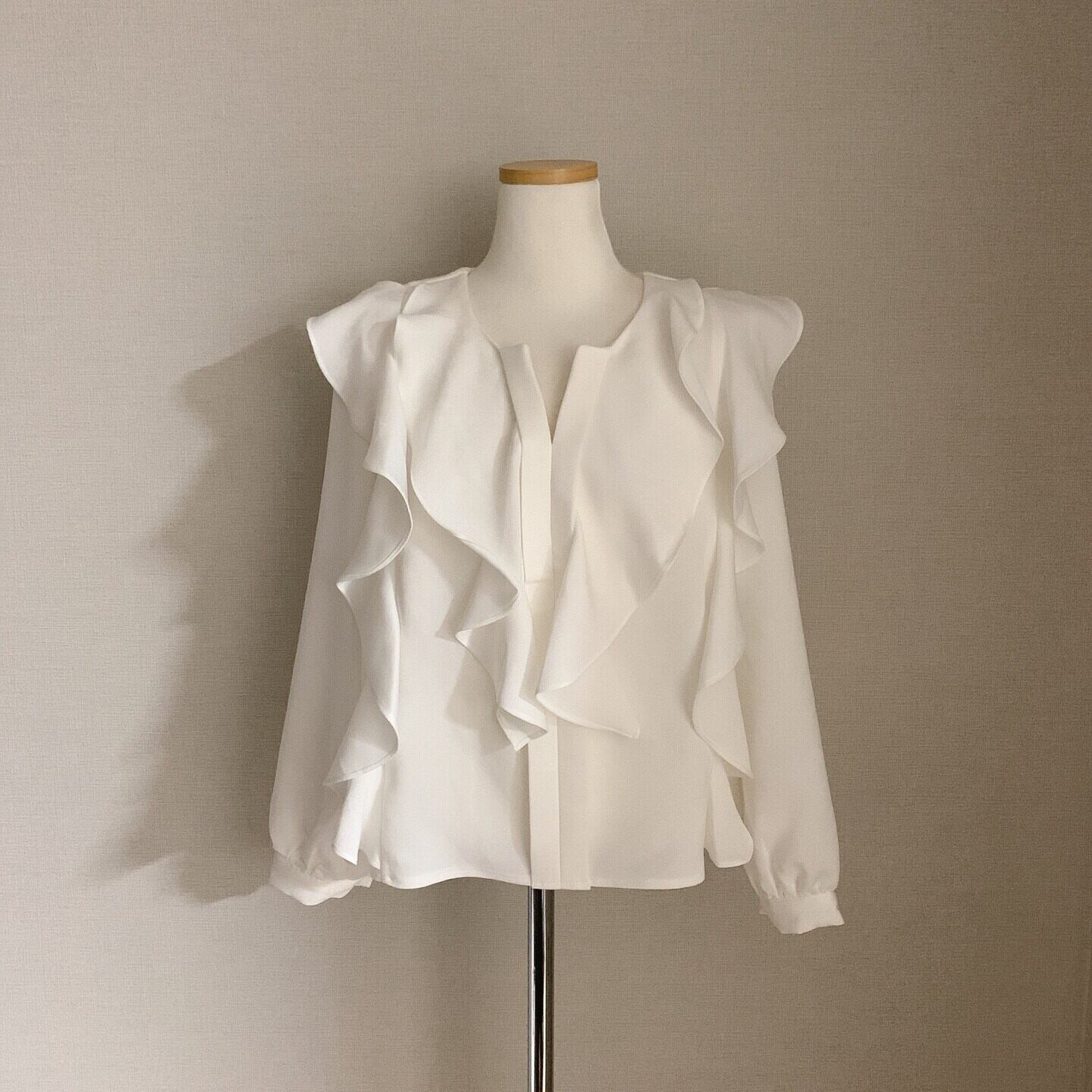 De Moda 春長袖シャツ ese トップスレイヤーフリル白シフォンシャツ OL ブラウス ロング ホワイト スプリング 春物