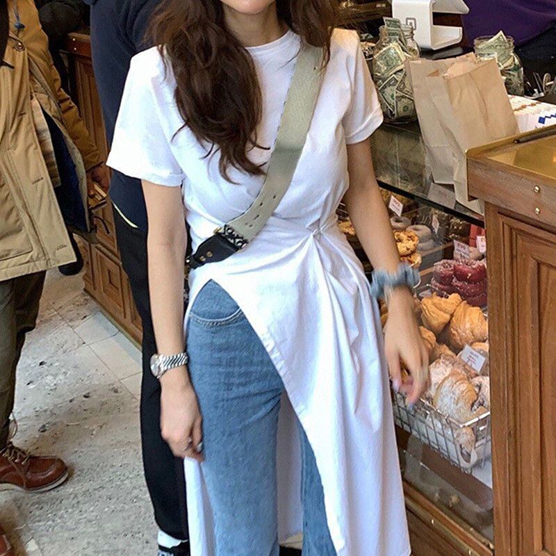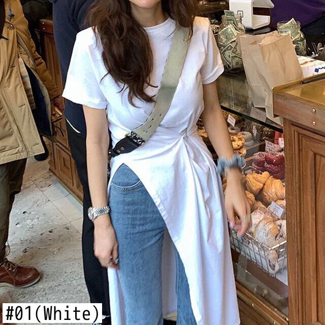 夏ゆるい不規則スプリット半袖白 Tシャツドレスローブワイルド O ネック Vestidos デシンプル ショート ホワイト ハーフスリーブ サマー 夏物 Oネック