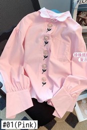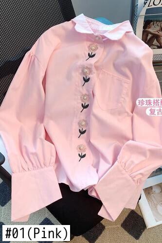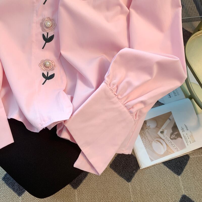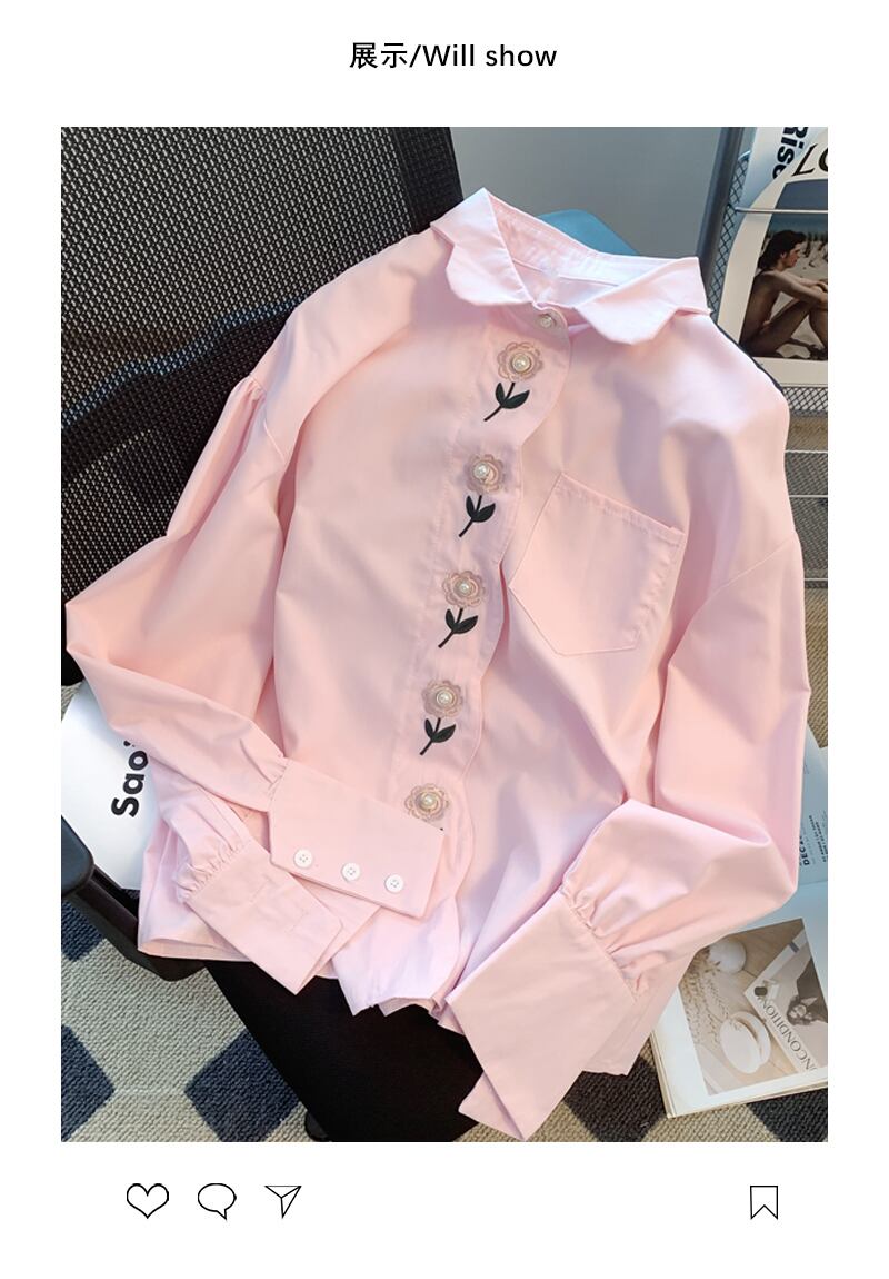 De Moda スウィート刺繍長袖シャツピンク花トップス春秋シャツ ロング レッド 大人ガーリー キュート カジュアル スプリング 春物 オータム 秋物 フラワーデザイン