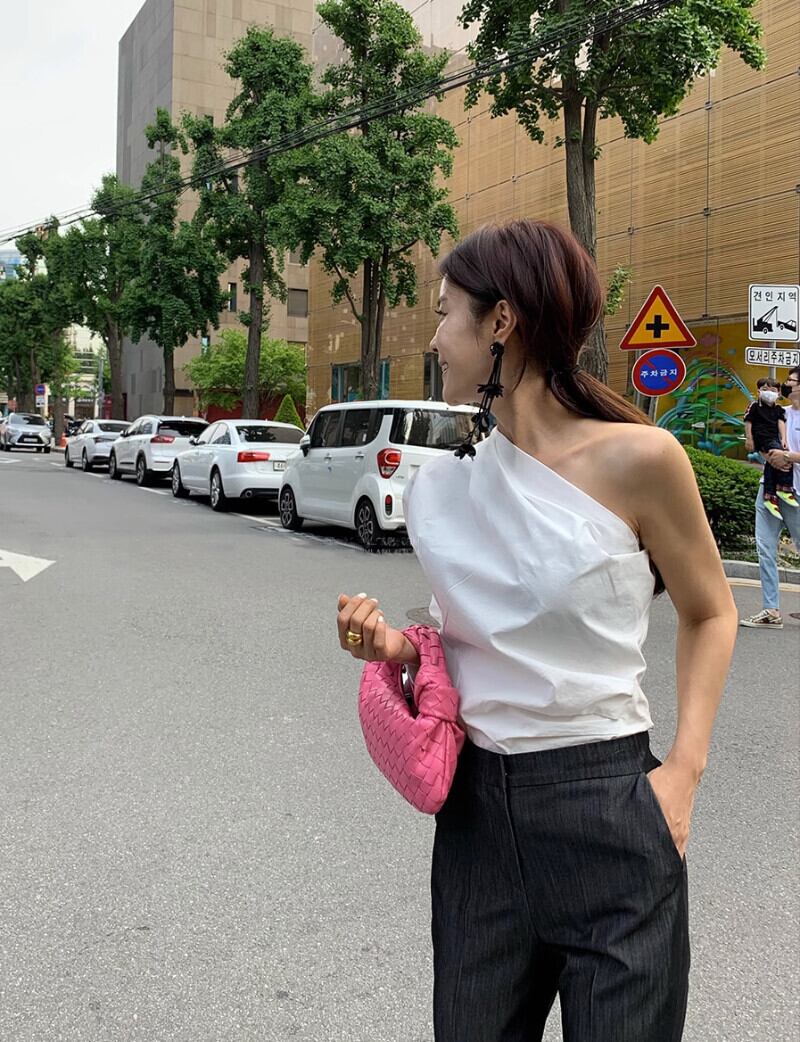 Blusa春斜めオフショルダープリーツ非対称無地スリム長袖白シャツワンブラウストップス ロング ホワイト スプリング 春物 ソリッドカラー