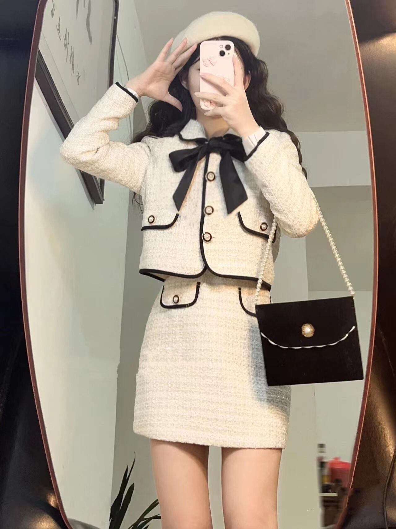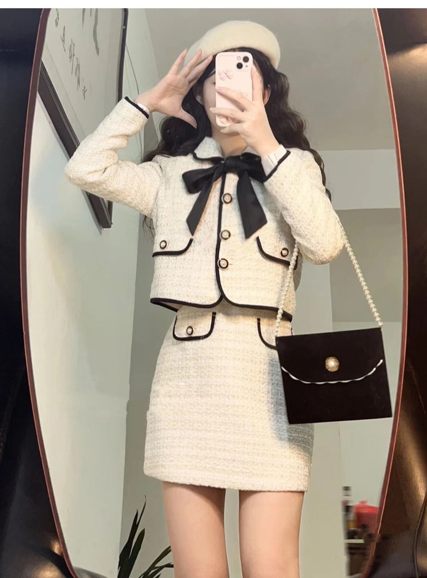 ボウ気質ツイード ジャケット チェック柄カーディガン トップス ボディコン スカート 2 点セット レディース衣装春スリム ショート テーラード コート レッド スプリング 春物
