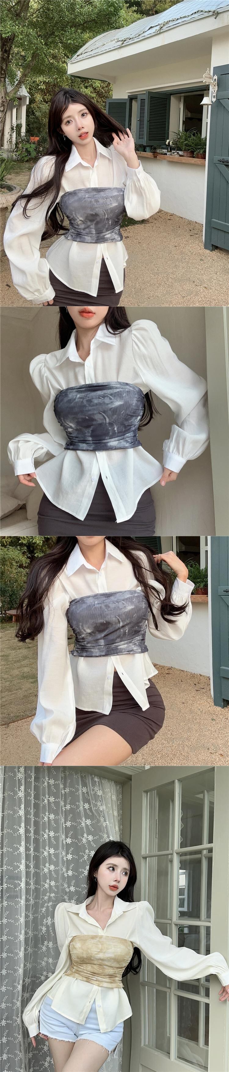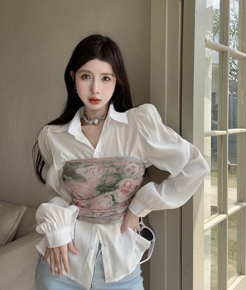 タンク キャミソール セクシー プリント 花柄 春 長袖 ホワイト シャツ レディース 2点セット ブラウス トップス ロング スプリング 春物