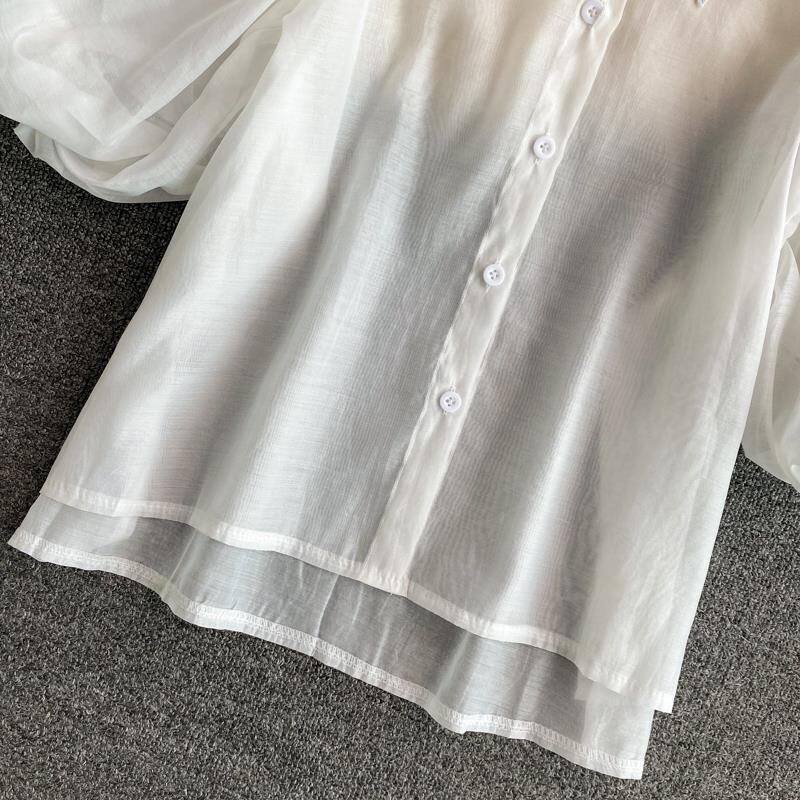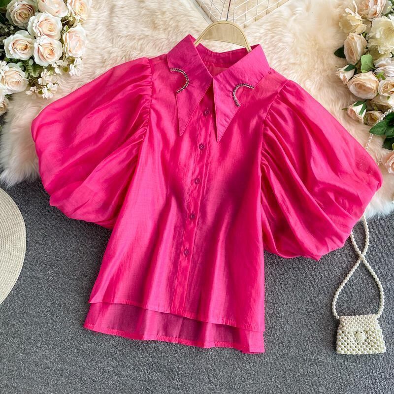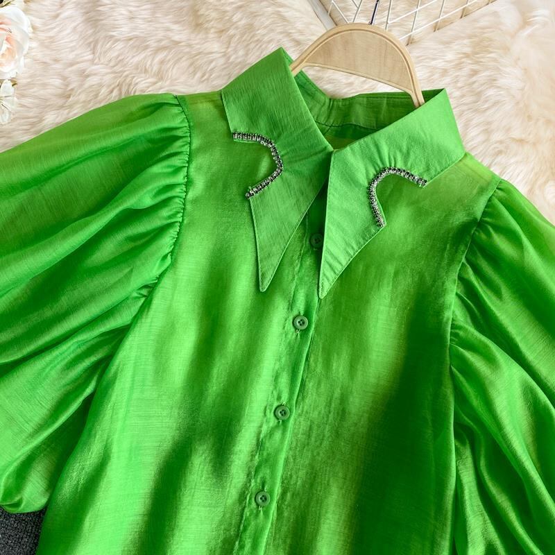 コートスタイル不規則ラインストーンシャツターンダウン襟ランタンスリーブシャツショートトップ