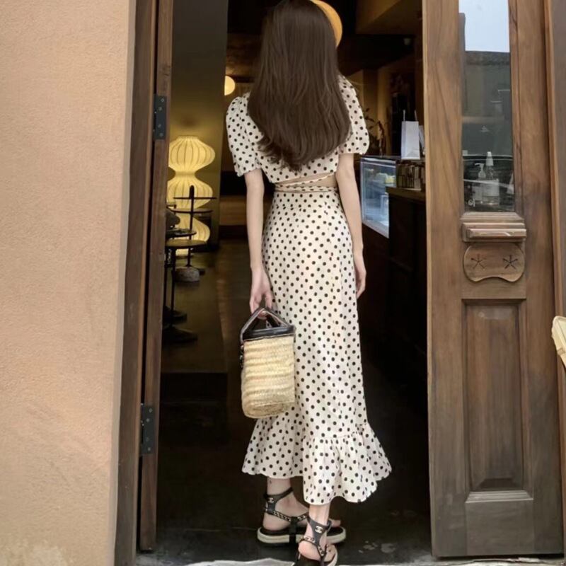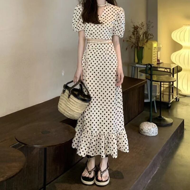 クロップトップ包帯スクエアブラウスレトロシャツ夏 V ネックフリル水玉スカートセットホリデー 2 Peice セット サマー 夏物 Vネック スクウェア