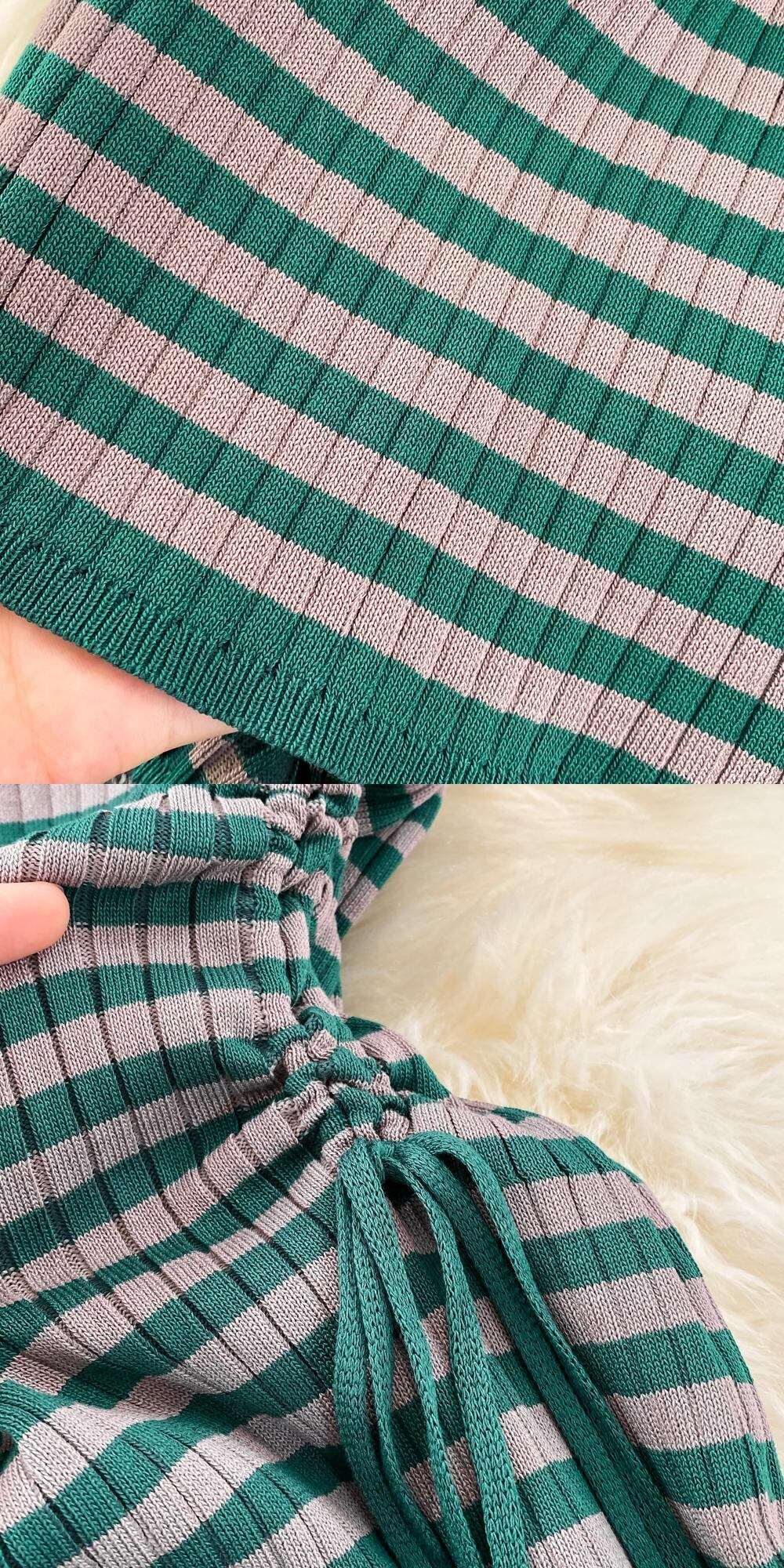 Oネック プリーツ グリーン ストライプワンピース ボディコンラップ ヒップ 夏物 半袖 ニットワンピース 巾着 レディース ショート ハーフスリーブ サマー