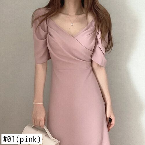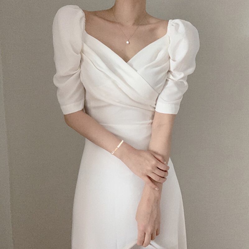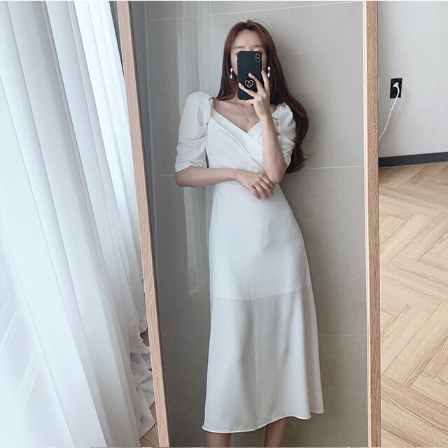Vestidos Vネック ウエストラップ パフ 半袖 ホワイト シフォン ワンピース Aライン OL ボディコン 夏ワンピース レディース ショート ハーフスリーブ サマー 夏物