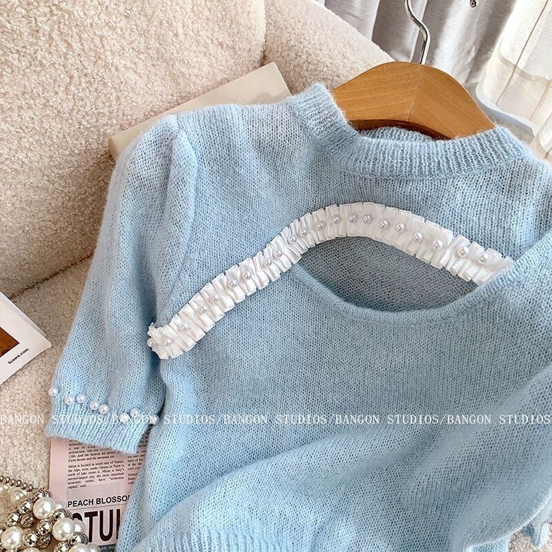 ジャンパープルオーバー中空アウト春スリムブルー半袖セーター薄型フリルニットトップスシャツ太陽ブラウス ショート ハーフスリーブ スプリング 春物