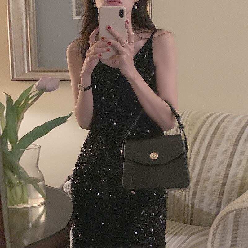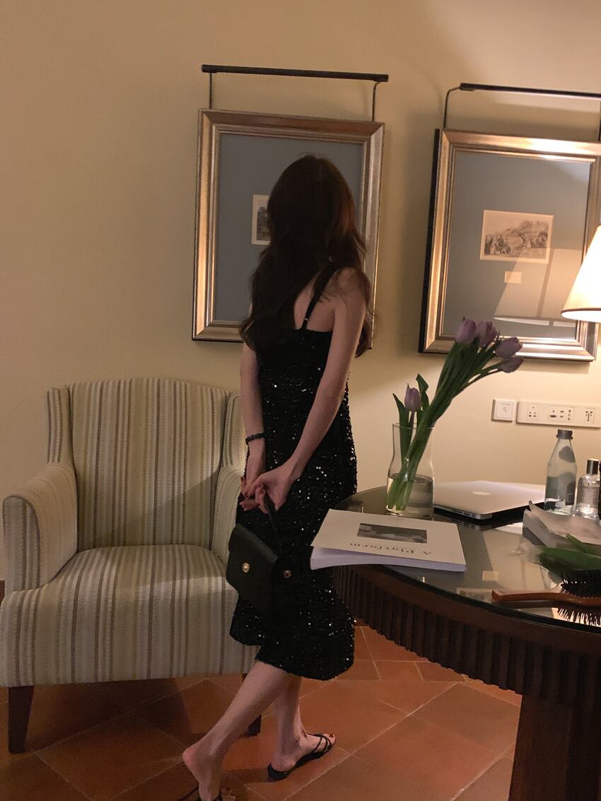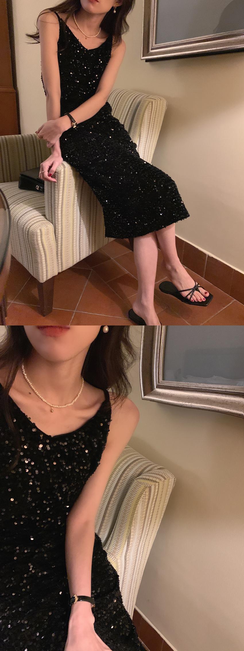 スリム V ネック黒スパンコール ドレス ノースリーブ ミッドレングス ベルベット パーティー ドレス ローブ スパゲッティ ストラップ ドレス ロング ブラック Vネック