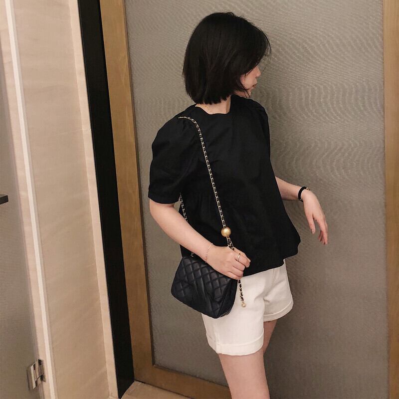 カミサ レトロ シンプル ブラック ドール シャツ トップス サマー パフ 半袖 ブラウス クロップトップ レースアップ ショート ハーフスリーブ 夏物