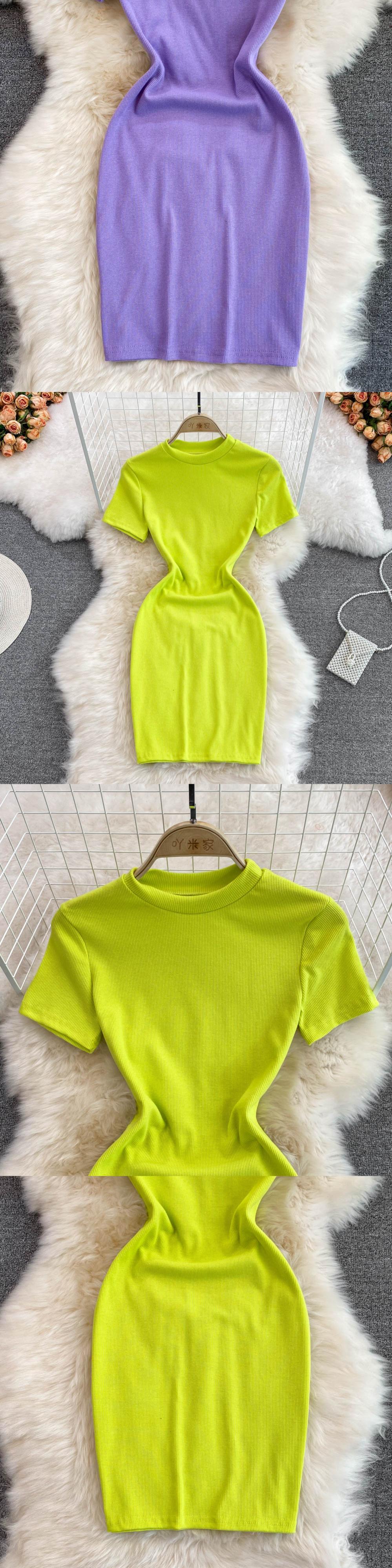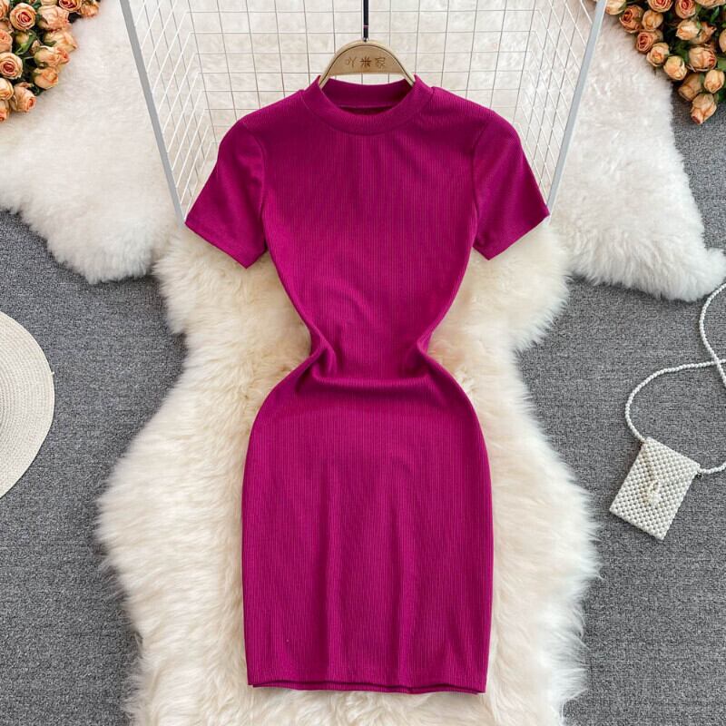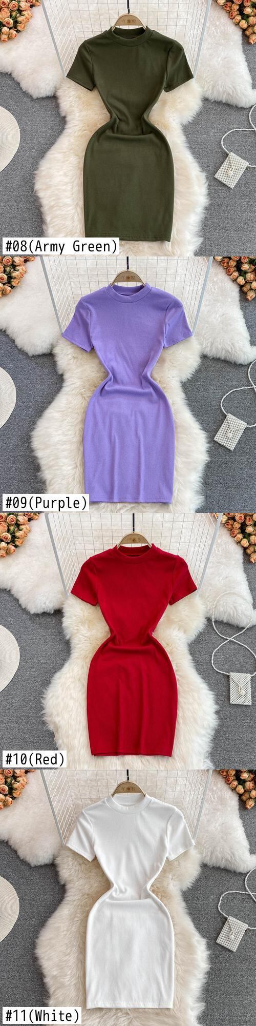夏ドレス無地 O ネック弾性タイトニット半袖ドレスボディコン Vestidos ミニドレス ショート ハーフスリーブ エラスティック 伸縮 サマー 夏物 Oネック ソリッドカラー
