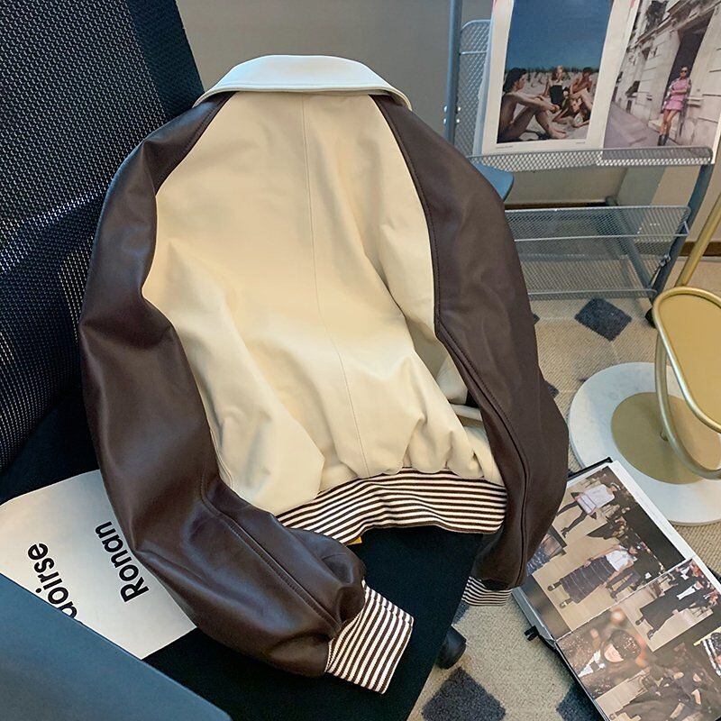 アメリカン レトロ コントラスト パッチワーク ボンバー ジャケット PU レザー コート ストリート ストライプ レザー ジャケット レディース