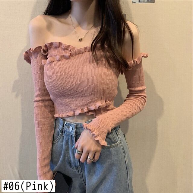 セクシースラッシュオフショルダークロップトップセータージャンパー長袖ニット黒、白ストライプセーターシャツ ロング ホワイト ブラック