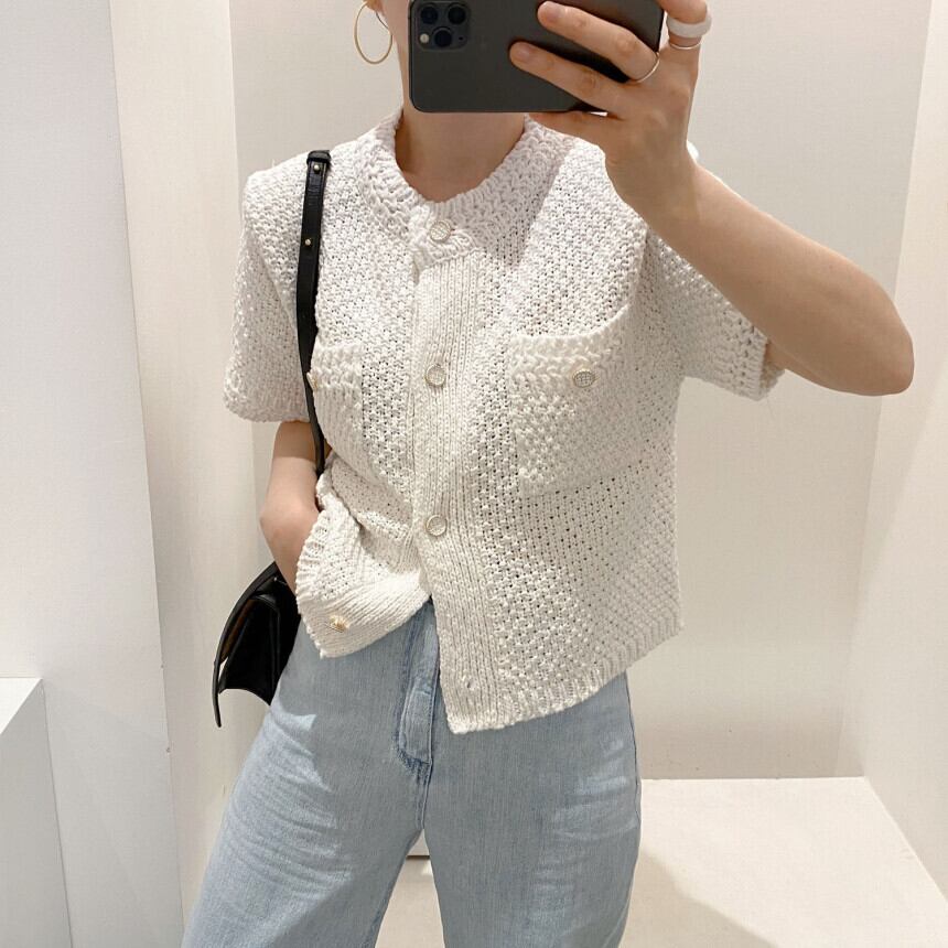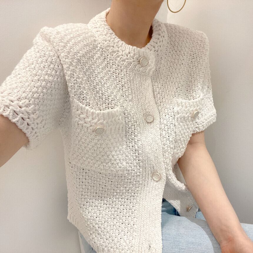 Wild O Chic シングルブレスト ルーズ 無地 ホワイト 半袖 カーディガン ニット コート シャツ レディース セーター ショート ハーフスリーブ ソリッドカラー
