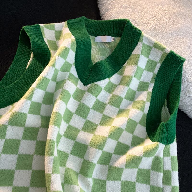 V ネック ブルー チェスボード セーター ベスト Colete Feminino Y2k プレッピー スタイル Chaleco ese カップル ニット ベスト トップ 春 スプリング 春物 Vネック