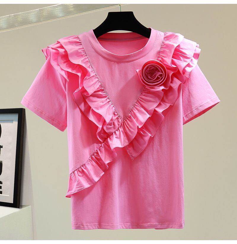 ルーズ無地トップス フリル Tシャツ 3D フラワー ストレッチ半袖 Tシャツ Ropa 美的服 Tシャツ ピンク クロップ トップス ショート ハーフスリーブ ソリッドカラー フラワーデザイン
